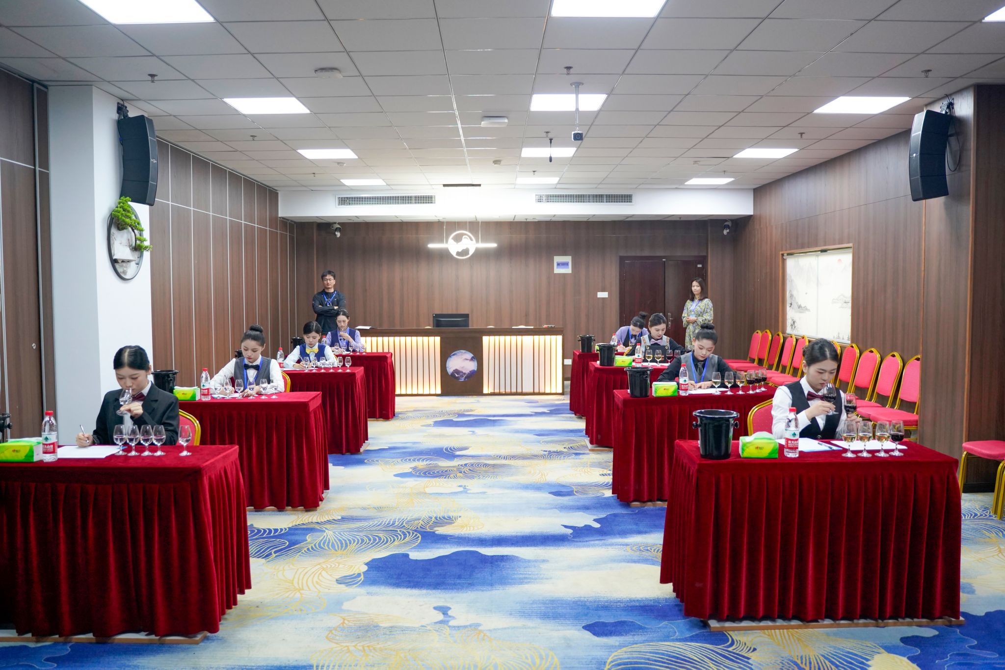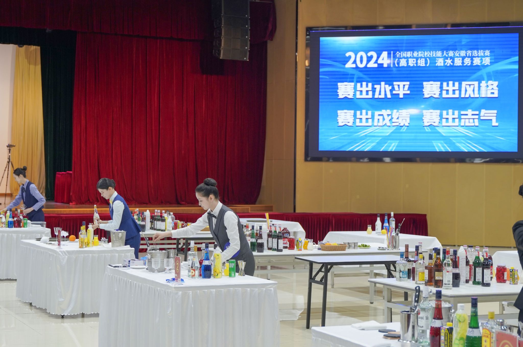 “酒水服务”赛项为团体赛,各参赛队围绕酒水品鉴与侍酒服务、鸡尾酒调制与服务及综合能力测评三个模块同台竞技,切磋技艺。酒水品鉴环节需要进行葡萄酒和烈酒现场品鉴,葡萄酒需要写出国家及产区、葡萄品种、香气特征、单宁、酸度等口感特征,烈酒需要写出品种、主要原料、国家与产地等。侍酒服务是采用侍酒情景模拟形式,选手完成酒杯摆台、老酒开瓶、滗酒、试酒、斟酒、分酒。鸡尾酒调制与服务环节需要完成两款自创鸡尾酒的制作及服务。综合能力测评包含理论考试和营销活动方案设计。“酒水服务”赛项共有四个参赛院校的八名选手同台竞技。