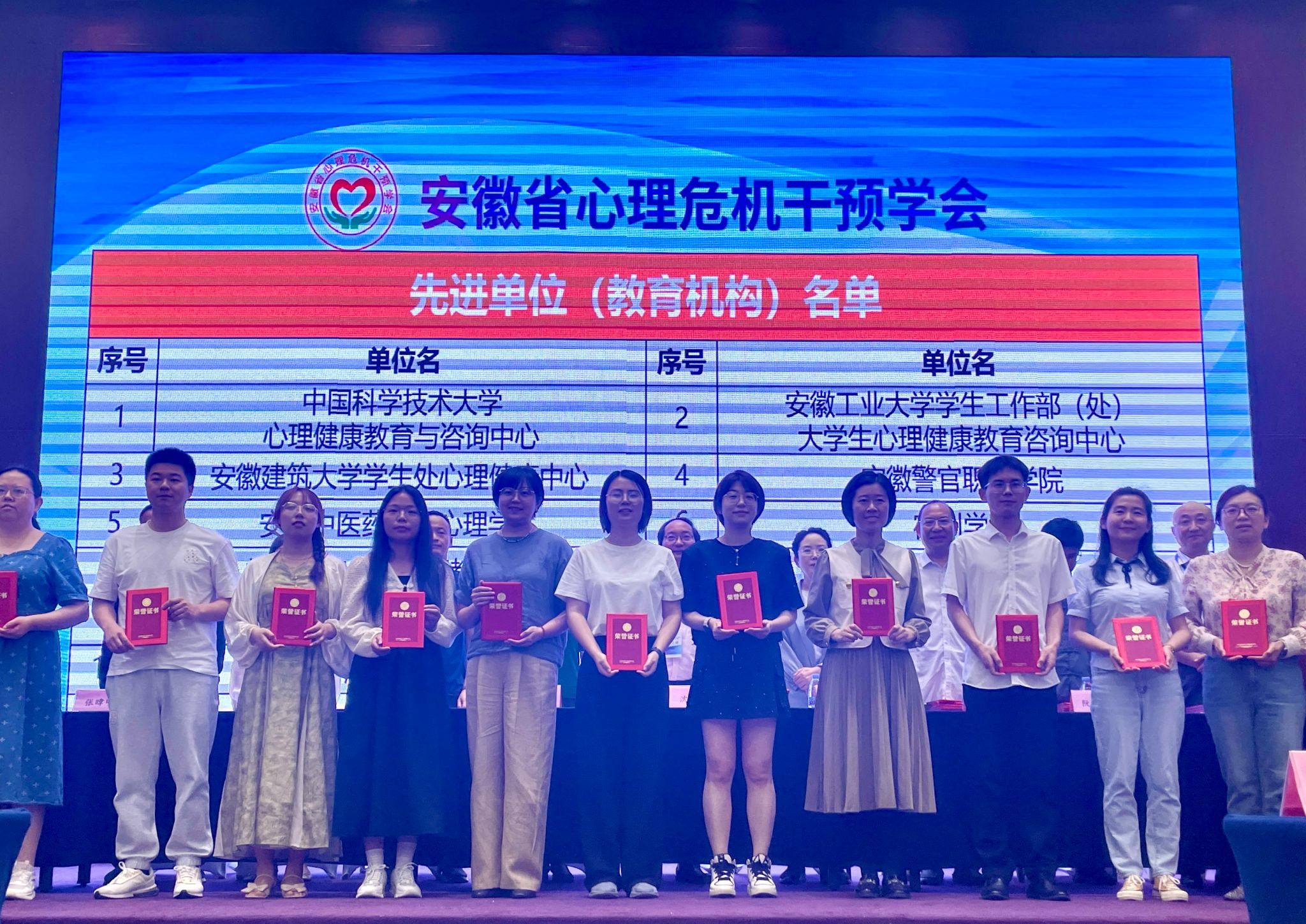 5月18日-19日,2024年安徽省心理危机干预学术年会在合肥举办,安徽省部分高校学生工作负责人,各高校心理中心主任、心理教师等近200人参会,会议对2023年度心理健康教育工作中表现优秀的高校及个人进行了表彰。经学校推荐、资格初审、专家评审等程序,我校荣获“先进单位”称号,学生处心理健康教育与咨询中心负责人李佳荣获“先进个人”称号。