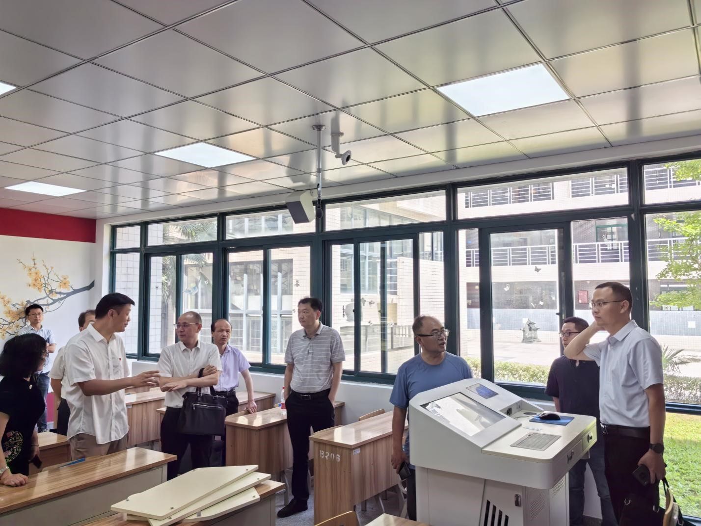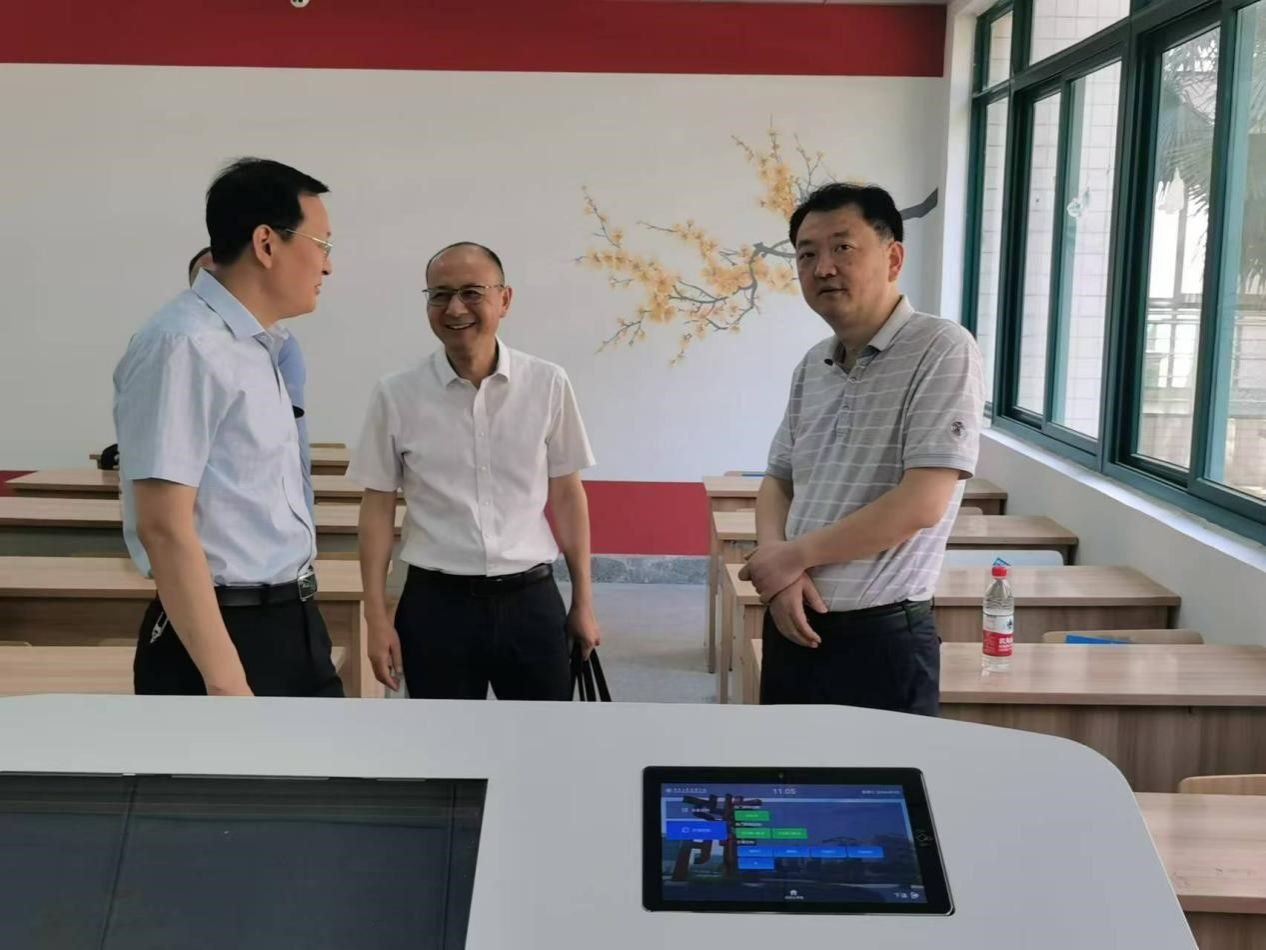 张志刚一行实地考察了学校的常态化智慧教室,并针对传统中控管理、物联管控、电子班牌等方面进行了详细的了解。双方从智慧教室的设备管控、扩声、显示、教师使用等方面进行深入交流。张志刚对我校教学信息化建设表示由衷赞赏,对我校的热情接待表示衷心感谢,同时也希望能加大互访交流,共促学校高质量发展。
