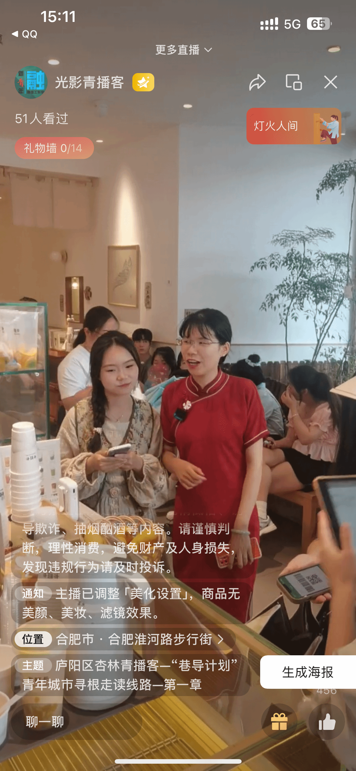 本场直播活动为团庐阳区委“巷导计划”青年城市寻根项目第一章,直播活动中,观众跟随志愿者主播的镜头欣赏“蓝色潮流走读路线”上的景点和美食,包括古教弩台、卡旺卡、詹记1955概念店、庐州印象Bowling Go潮玩运动街区、北油坊巷、逍遥津小学、撮造山巷、国潮壁画、“庐小胖”IP雕像、李鸿章故居陈列馆、庐州烤鸭店。志愿者主播详细介绍每个景点的历史背景、文化意义以及旅游注意事项,以及美食背后的故事和文化内涵,让广大网友即使身处家中也能感受到身临其境的旅游体验,深入了解合肥市庐阳区的独特魅力。