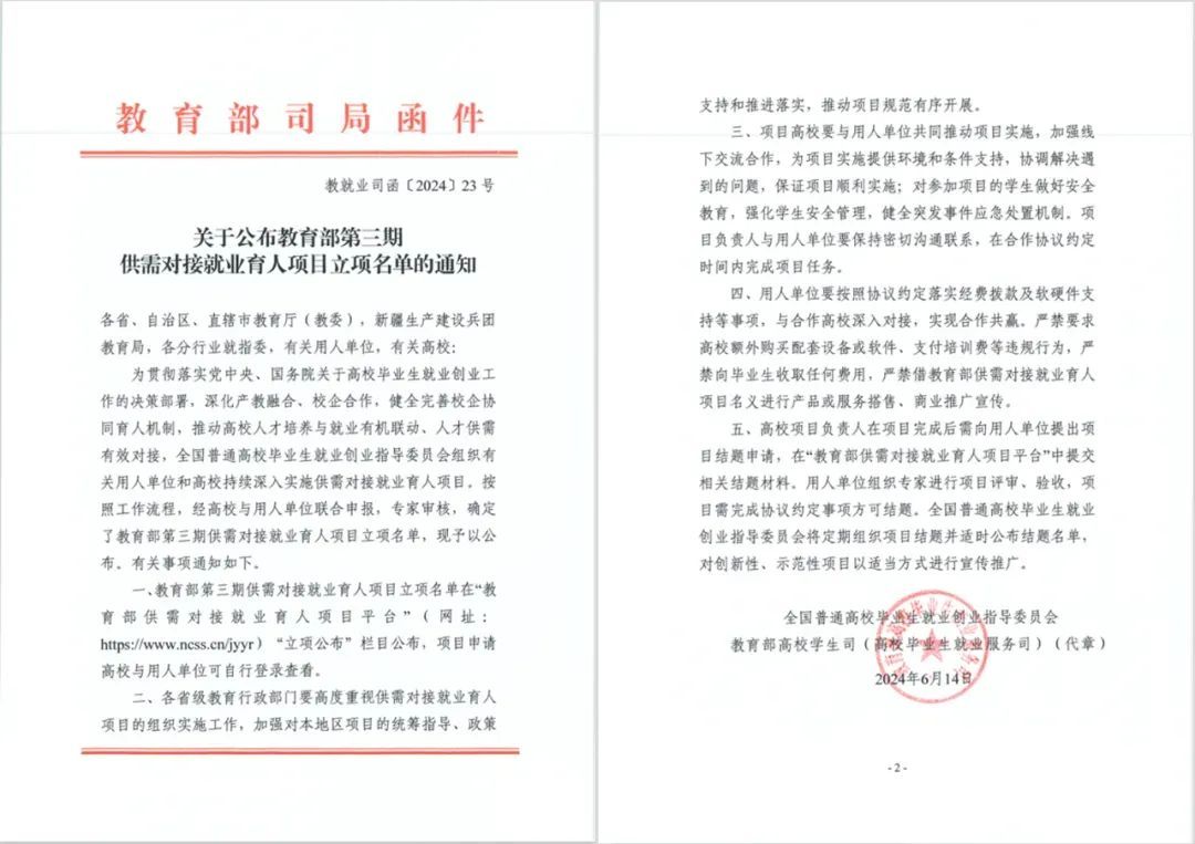 6月14日,教育部高校学生司发布《关于公布教育部第三期供需对接就业育人项目立项名单的通知》(教就业司函〔2024〕23号),由我校艺术设计学院团队申报与厦门风云科技股份有限公司共建就业实习基地项目正式获批立项。