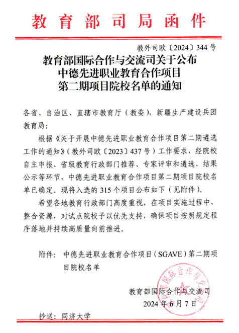 6月7日,教育部国际合作与交流司发布《关于公布中德先进职业教育合作项目第二期项目院校名单的通知》(教外司欧〔2024〕344号),我校正式获批立项为智能制造领域试点院校单位。