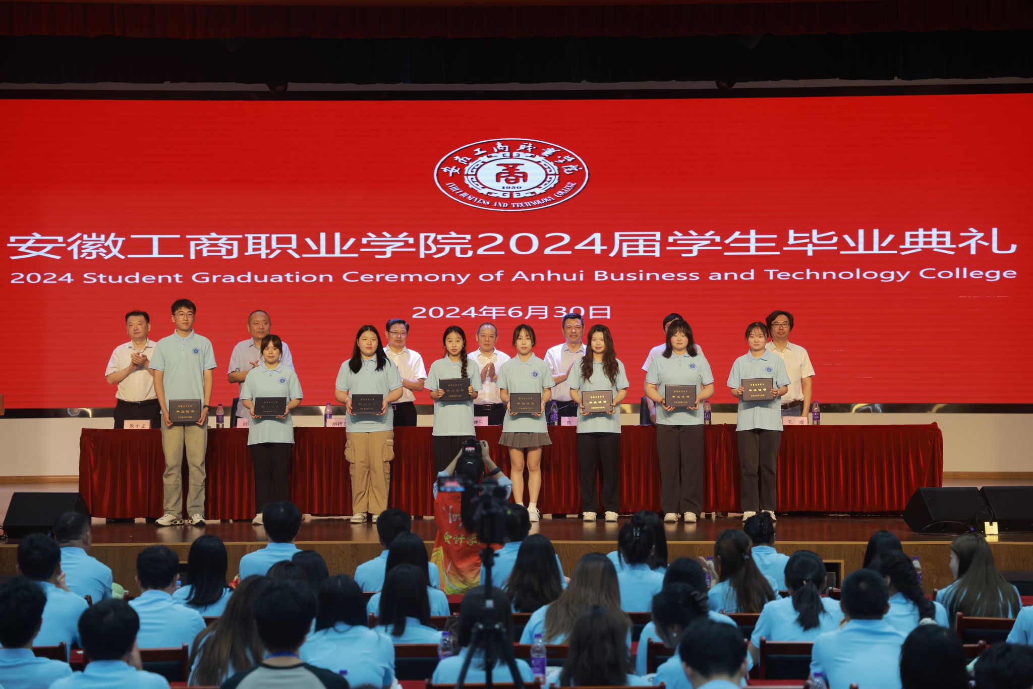 党委委员、副院长胡捍东分别宣读了《关于准予安徽工商职业学院2024届毕业生毕业的决定》和《安徽工商职业学院关于表彰2024届优秀毕业生的决定》,与会领导为毕业生代表颁发毕业证书,并为优秀毕业生代表颁发优秀毕业生荣誉证书。