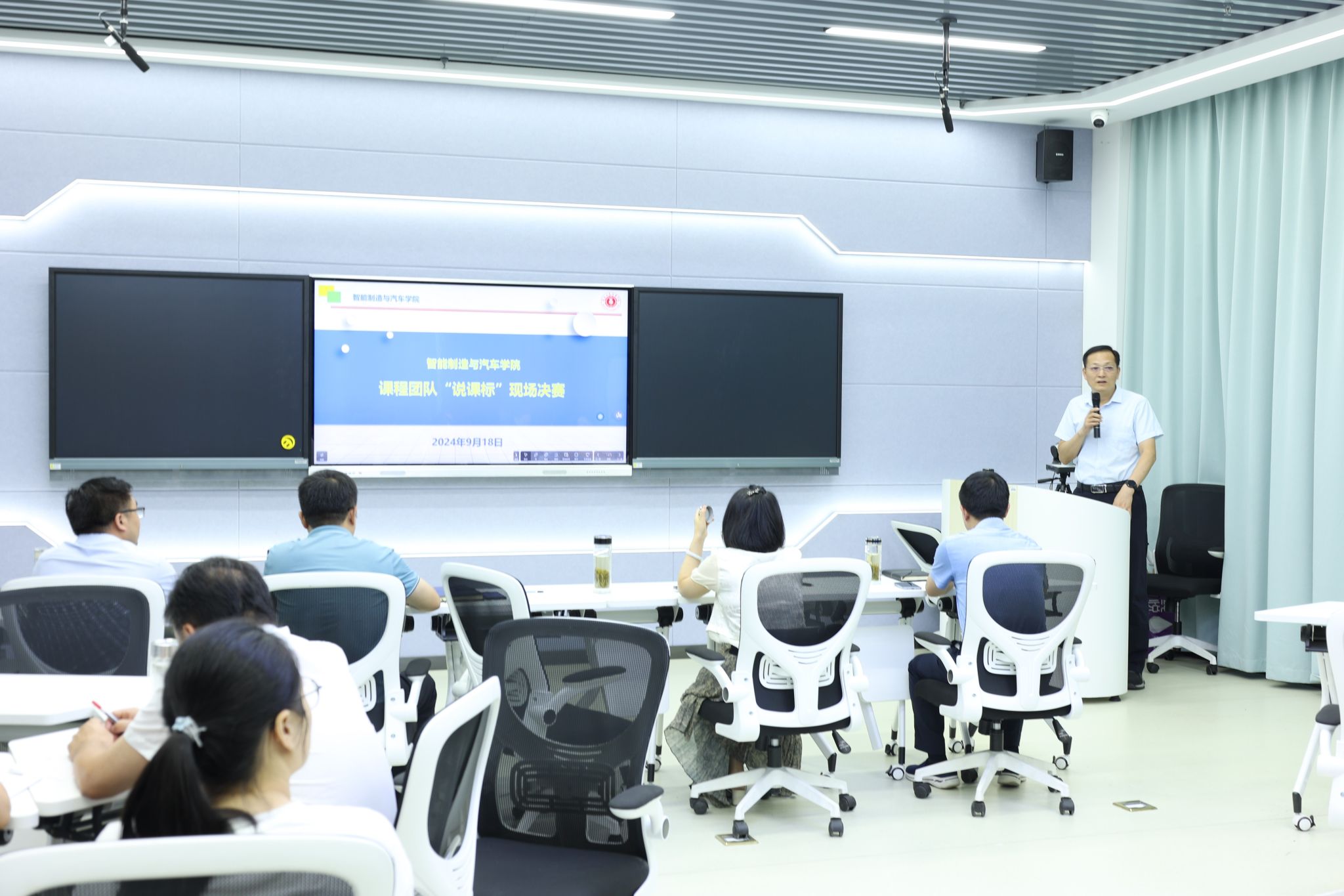 根据学院印发的《关于开展智能制造与汽车学院课程标准制(修)订和评比的通知》要求,2024年9月18日下午,智能制造与汽车学院在综合楼仿真教学与资源创作实训室成功举办了课程团队“说课标”现场决赛。党委委员、副院长陈章奇,教务处处长张震,教务处副处长郭雪峰和余国锋以及智能制造与汽车学院院长姚庆锋和智能制造与汽车学院党总支书记丁浩等领导莅临现场,担任比赛专家评委,各课程团队全体成员参加了本次活动。