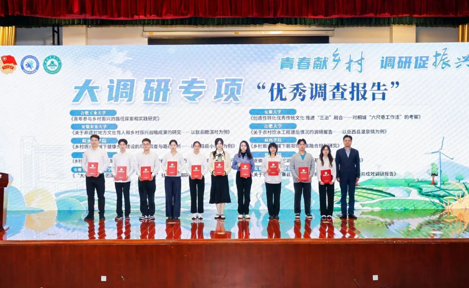 2024年10月21日,安徽省“百校千镇万村”大学生乡村振兴大调研总结分享活动在安徽农业大学图书馆第一报告厅顺利举行。我校信息工程学院团总支书记胡梦佼老师指导的《关于农发行金寨县支行在乡村振兴中的数字金融创新与成效调研报告》从全省30所高校、上千支实践团队提交的作品中脱颖而出,荣获“优秀调研报告”。