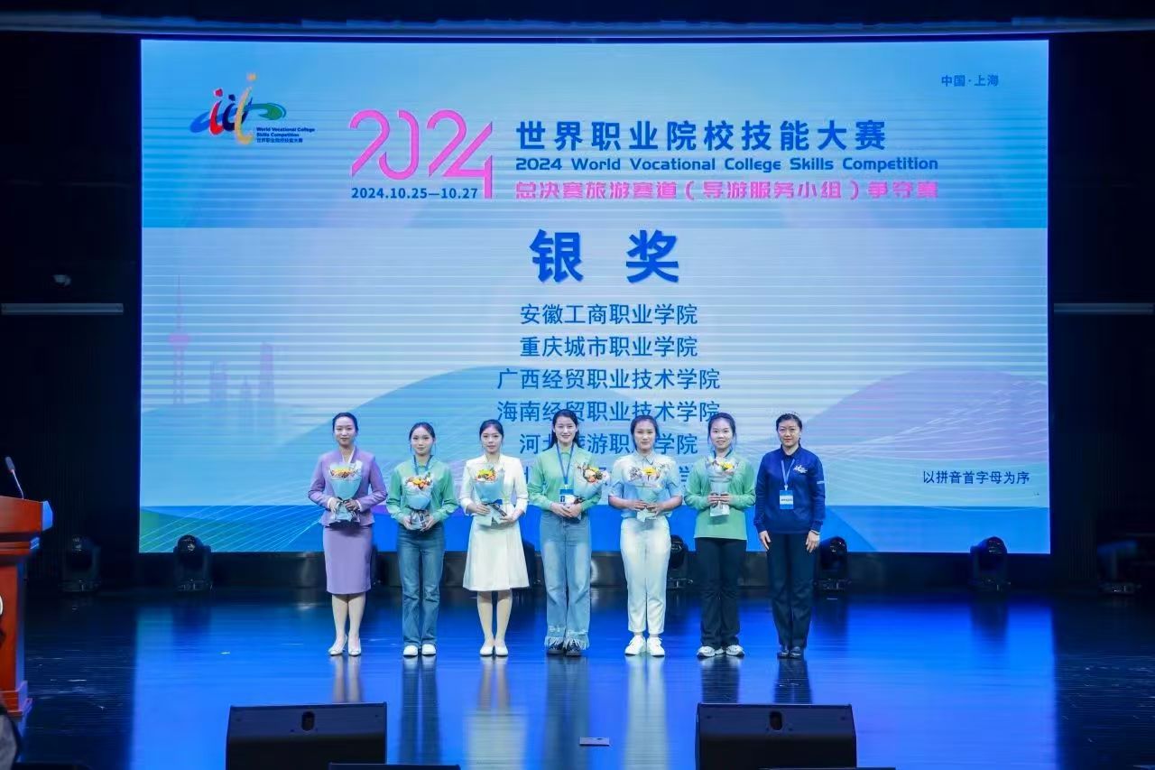10 月27 日,为期两天的2024 年世界职业院校技能大赛总决赛旅游赛道(导游服务小组)争夺赛在上海旅游高等专科学院圆满落幕。本次赛事由教育部、文化和旅游部等部门主办,上海市教育委员会承办,上海旅游高等专科学校协办,有来自全国31个省、自治区、直辖市的63支参赛队伍参加角逐。我校三位选手黄倩、王馨、白家宝在指导教师王彦龙、王西涛的悉心指导下,以精湛的专业技能和出色的表现,在众多强队中脱颖而出,最终荣获银奖。
