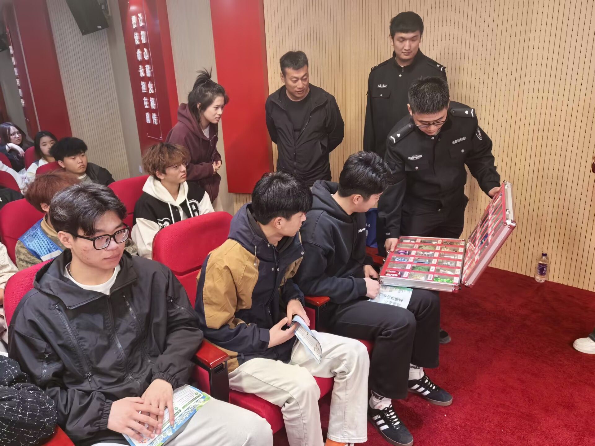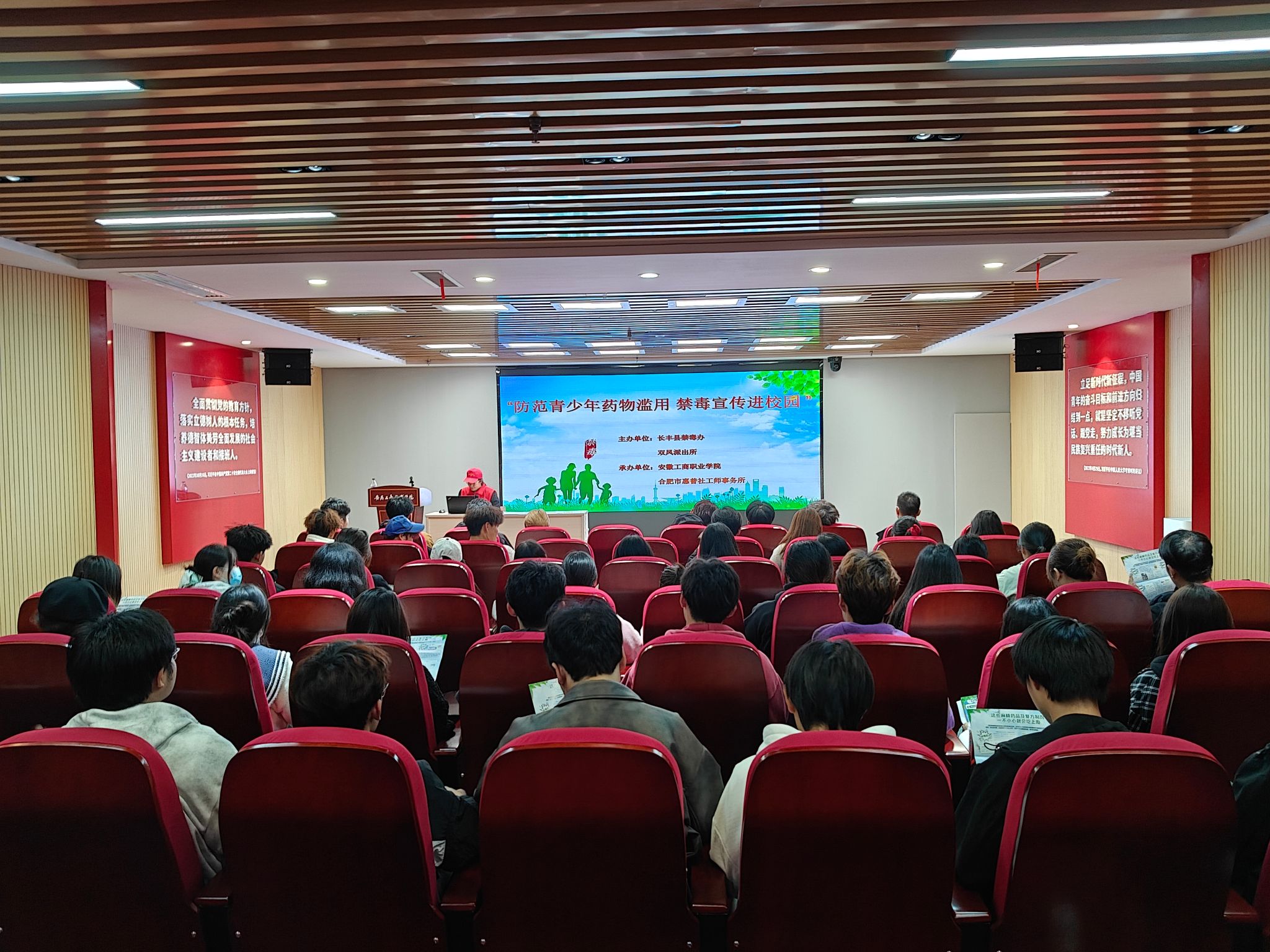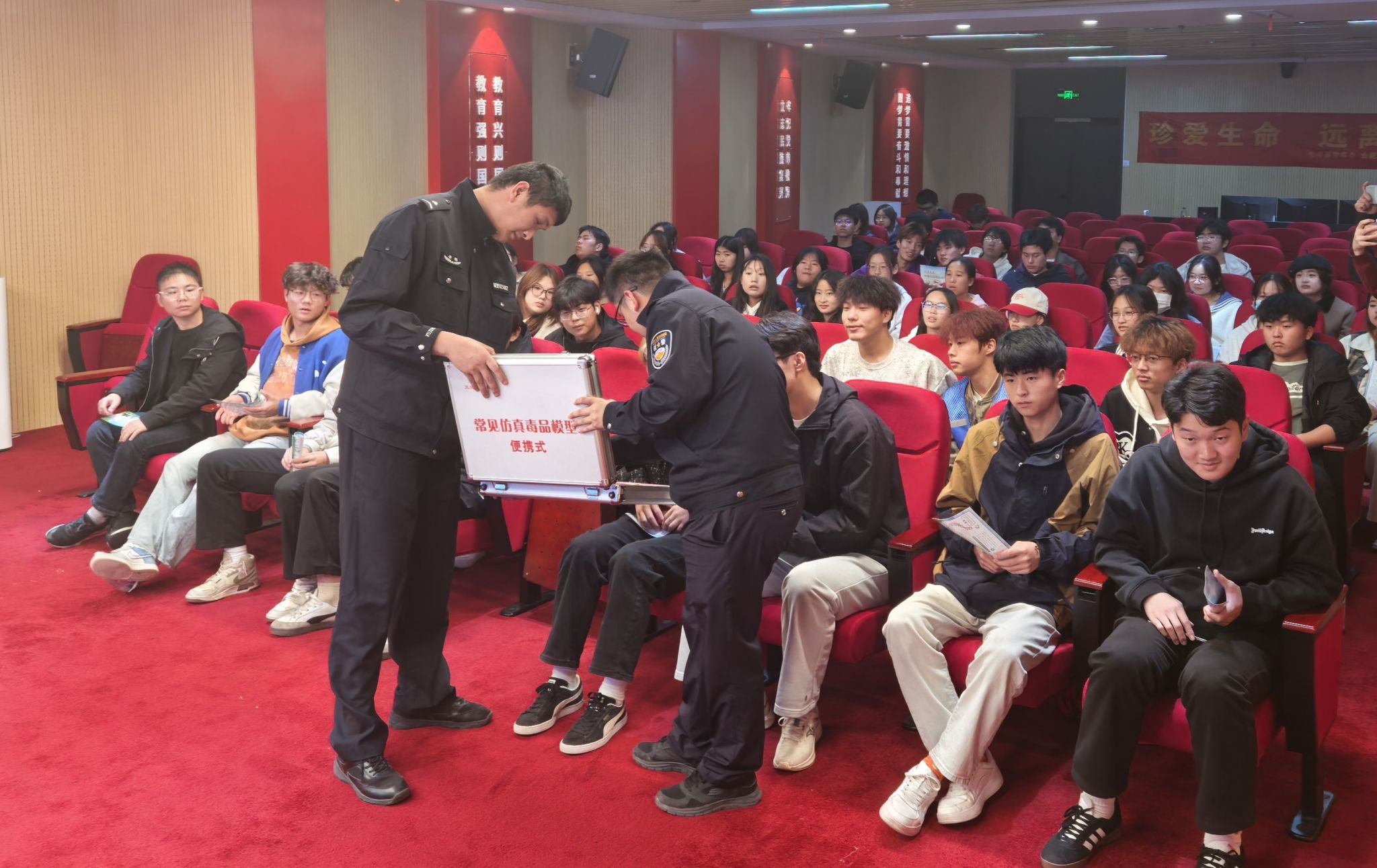 宣讲活动在学校综合楼三楼红色报告厅举行。活动开始前,双凤派出所的民警向同学们发放了《禁毒宣传手册》,为每位参会学生提供了丰富的禁毒知识和防范常识。