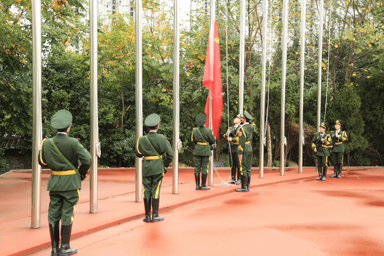早上7时20分,学校国旗护卫队迈着整齐的步伐护送着五星红旗走向升旗台,雄壮的《义勇军进行曲》响起,鲜艳的五星红旗冉冉升起,全体师生神情庄重,满怀对伟大祖国的热爱与敬意,面向五星红旗行注目礼。
