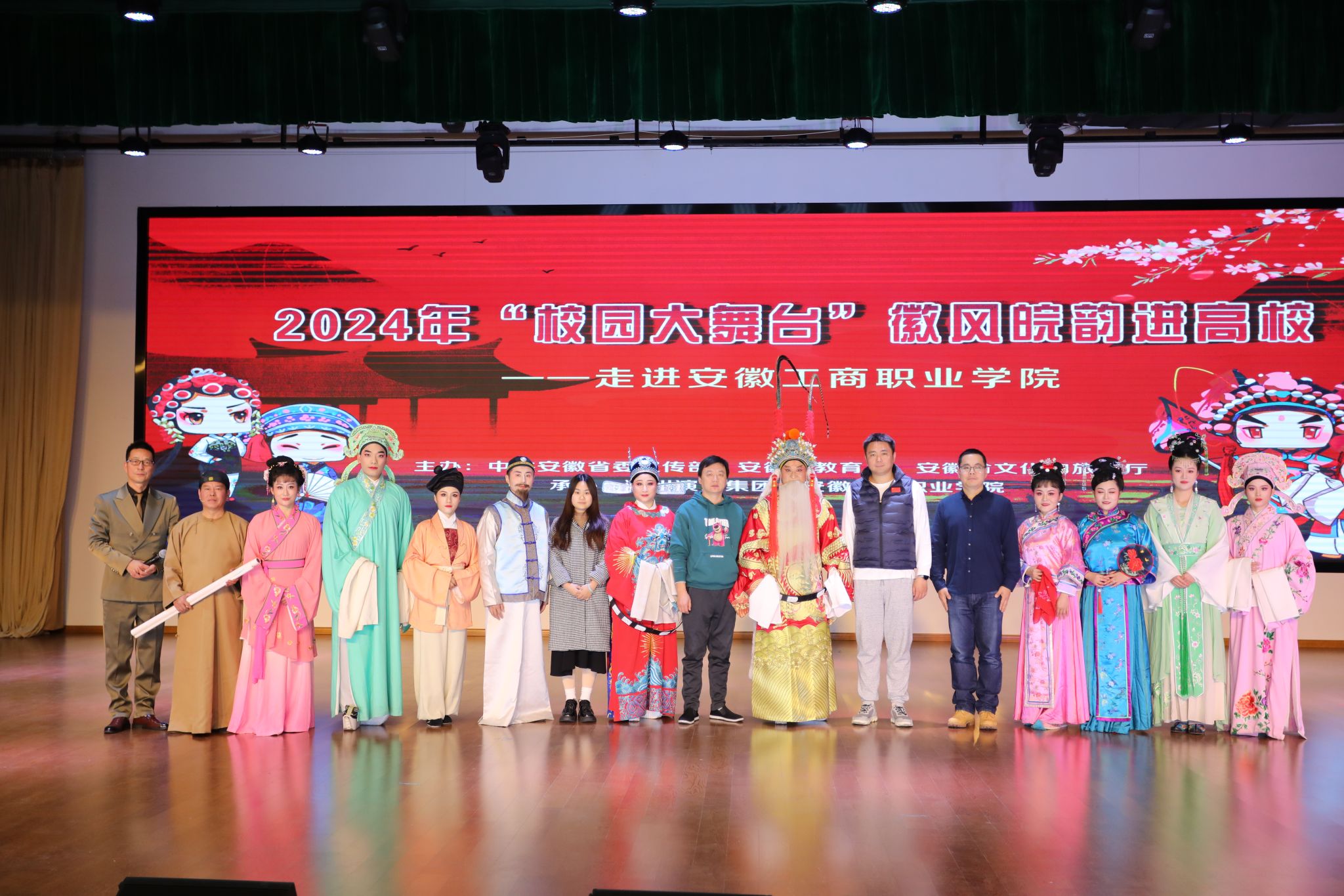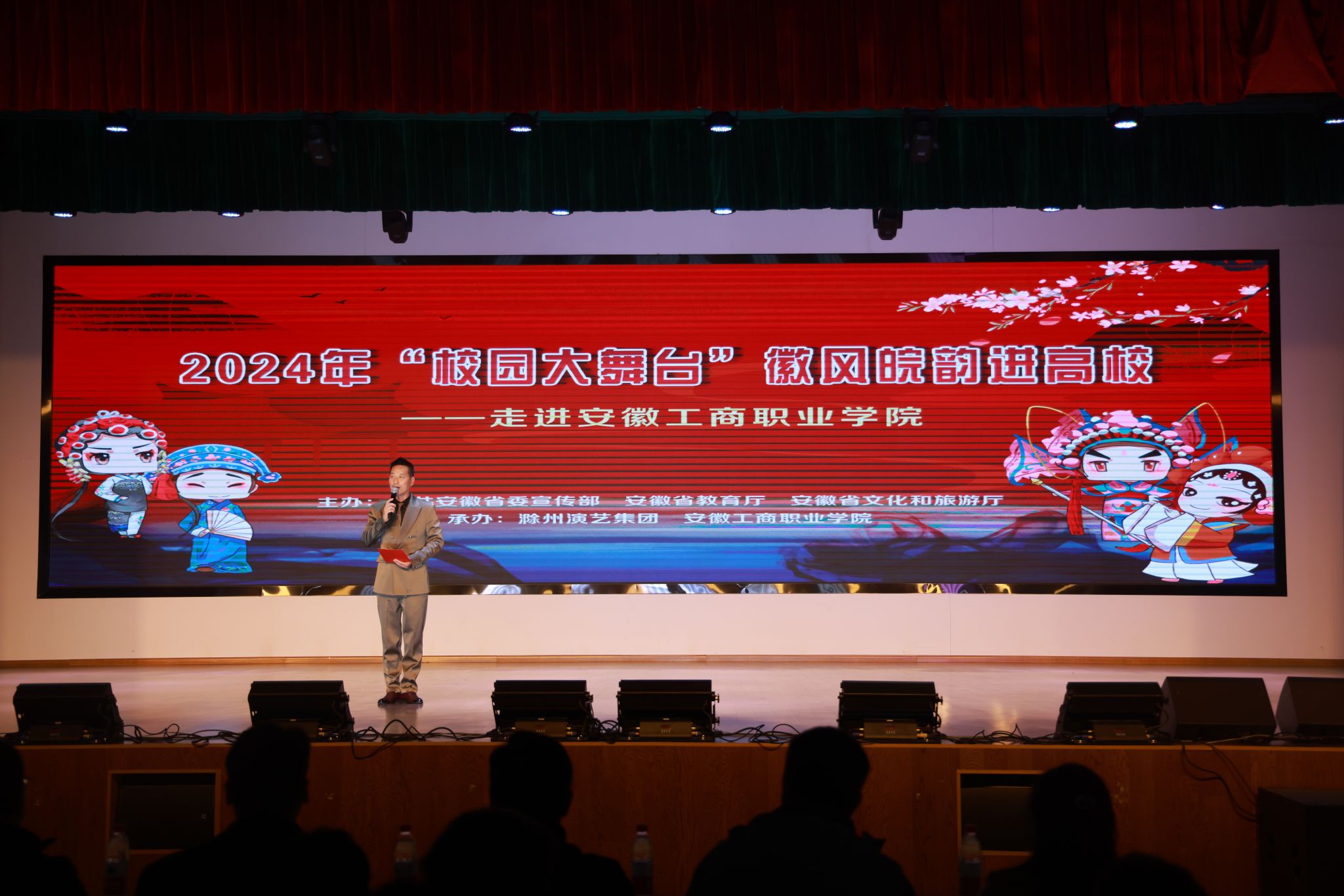 戏韵悠长,匠心传承。为贯彻落实习近平文化思想,深入学习贯彻习近平总书记考察安徽重要讲话精神,大力弘扬优秀传统文化,传承中华戏曲文化,提高大学生艺术修养和文化自信,扎实推进“时代新人铸魂工程”,由中共安徽省委宣传部、安徽省教育厅、安徽省文化和旅游厅联合主办,滁州演艺集团和安徽工商职业学院共同承办的2024年“校园大舞台”徽风皖韵进高校活动于12月4日下午在我校大学生活动中心精彩上演。校党委委员、党委副书记陈行及师生代表共600余人到场观看演出。