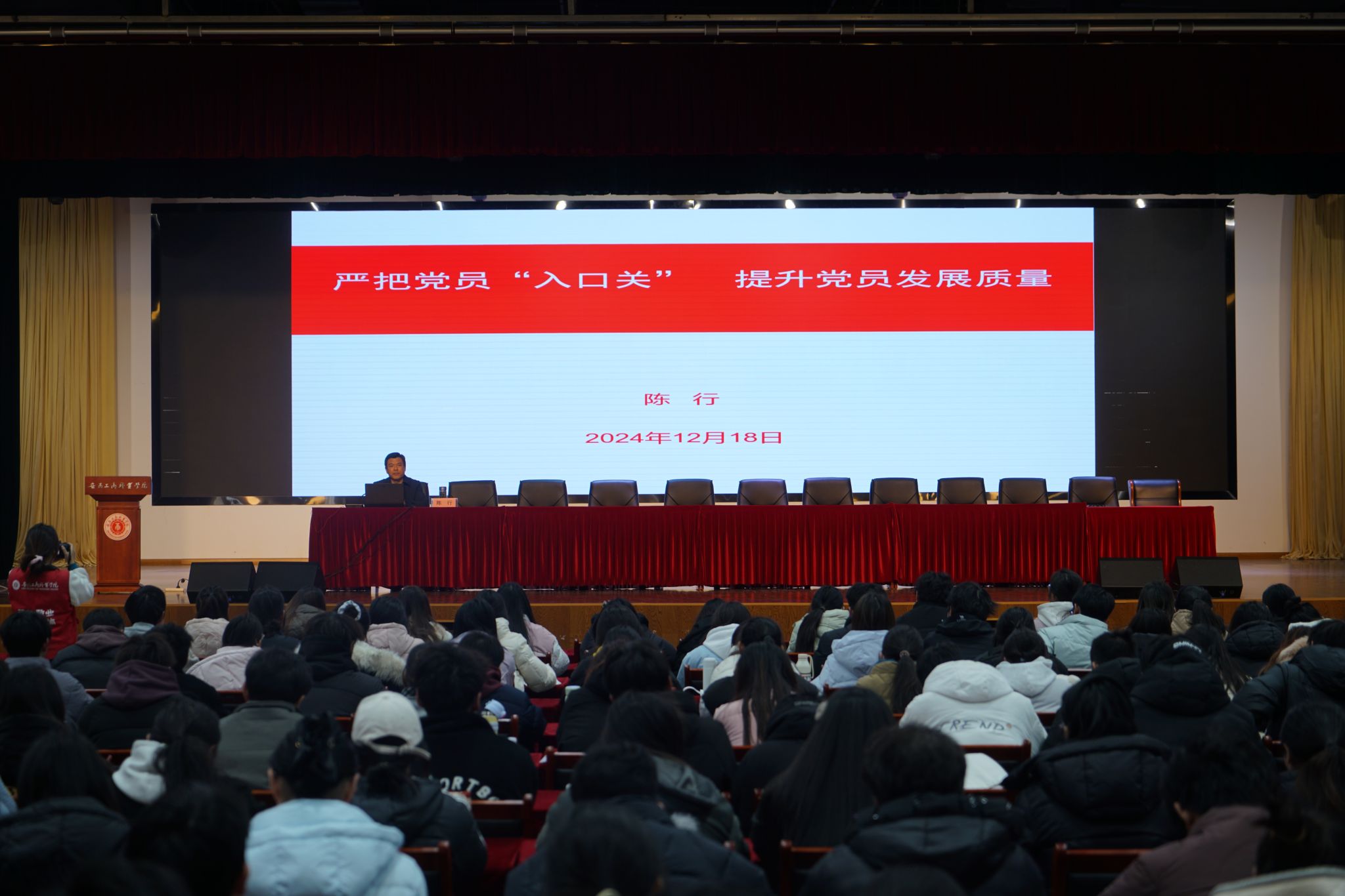 12月18日,校党委副书记陈行作题为《严把党员“入口关” 提升党员发展质量》的专题报告。他从严把“入口关”、严把“程序关”、严把“考察关”、严把“责任关”四个方面详尽阐释了严格党员发展标准、规范党员发展流程、提升党员队伍素质和增强纪律责任意识。并指出只有持续提升党员队伍质量,才能使党永葆生机活力,带领全国人民在实现中华民族伟大复兴的征程上稳步前行,汇聚起磅礴力量,创造更加辉煌的业绩。