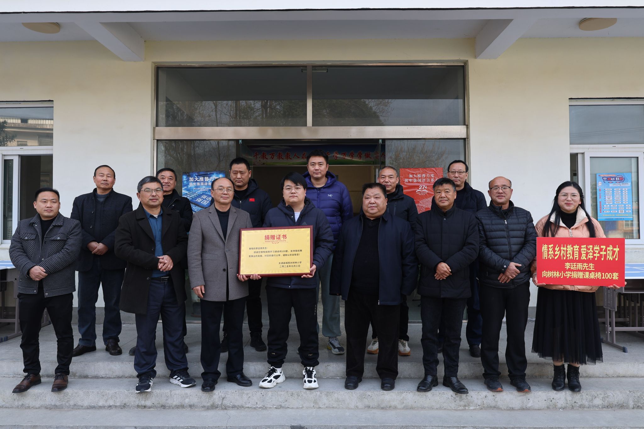 2025年1月3日,一场意义深远的捐赠仪式在太湖县城西乡树林小学举行,此次活动我校团委在校党委的坚强领导下,积极响应社会公益号召,主动联系金融行业的社会爱心人士向树林小学和大龙小学捐赠价值人民币2万元的100套崭新课桌椅,旨在改善该校的教学条件及学习环境。太湖县教育局、城西乡人民政府有关领导出席本次捐赠仪式。