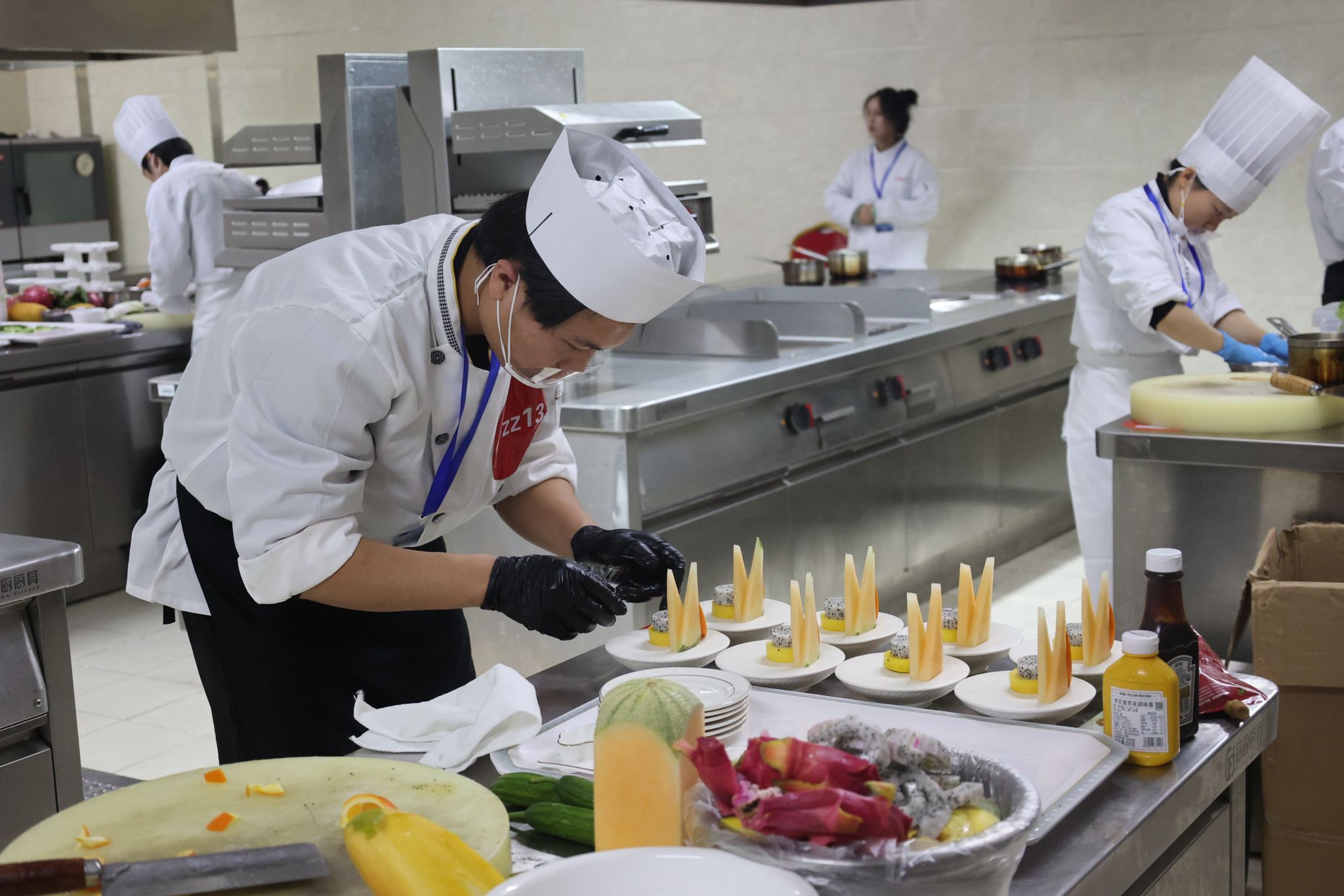 烹饪赛项为团队赛,来自全省7所高职院校的13支参赛队伍参赛。比赛由宴席设计、菜点制作、宴席展评三个分项目组成。通过宴席设计书策划、陈述答辩、基本功测试、宴席作品制作、宴席展台设计等考核内容,检验参赛选手的现场设计与应变能力、营养搭配与计算能力、规范操作水平及创新创意能力和水平,激发学生团队合作意识与实践成才热情。赛场上,各参赛选手将平时累积的知识与创新思维相结合,道道菜品别出心裁、匠心设计,精致且富有文化内涵。