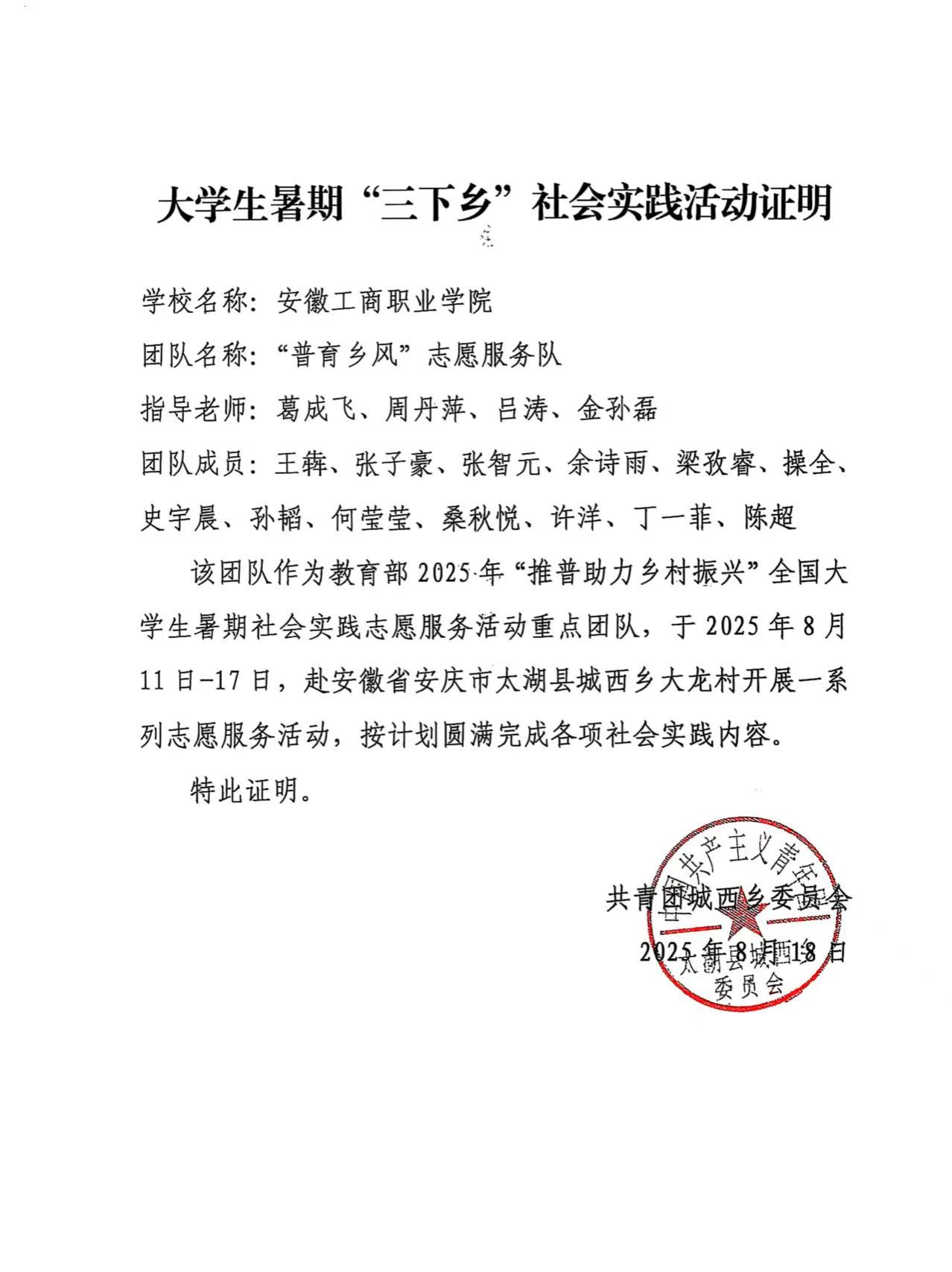 2025年8月11日-17日,2025年教育部“推普助力乡村振兴”全国大学生暑期社会实践志愿服务活动重点团队——安徽工商职业学院“普育乡风”志愿服务队赴太湖县大龙村开展为期一周的社会实践志愿服务活动。志愿服务活动开展前夕,团队在马克思主义学院会议室举行了出征仪式。