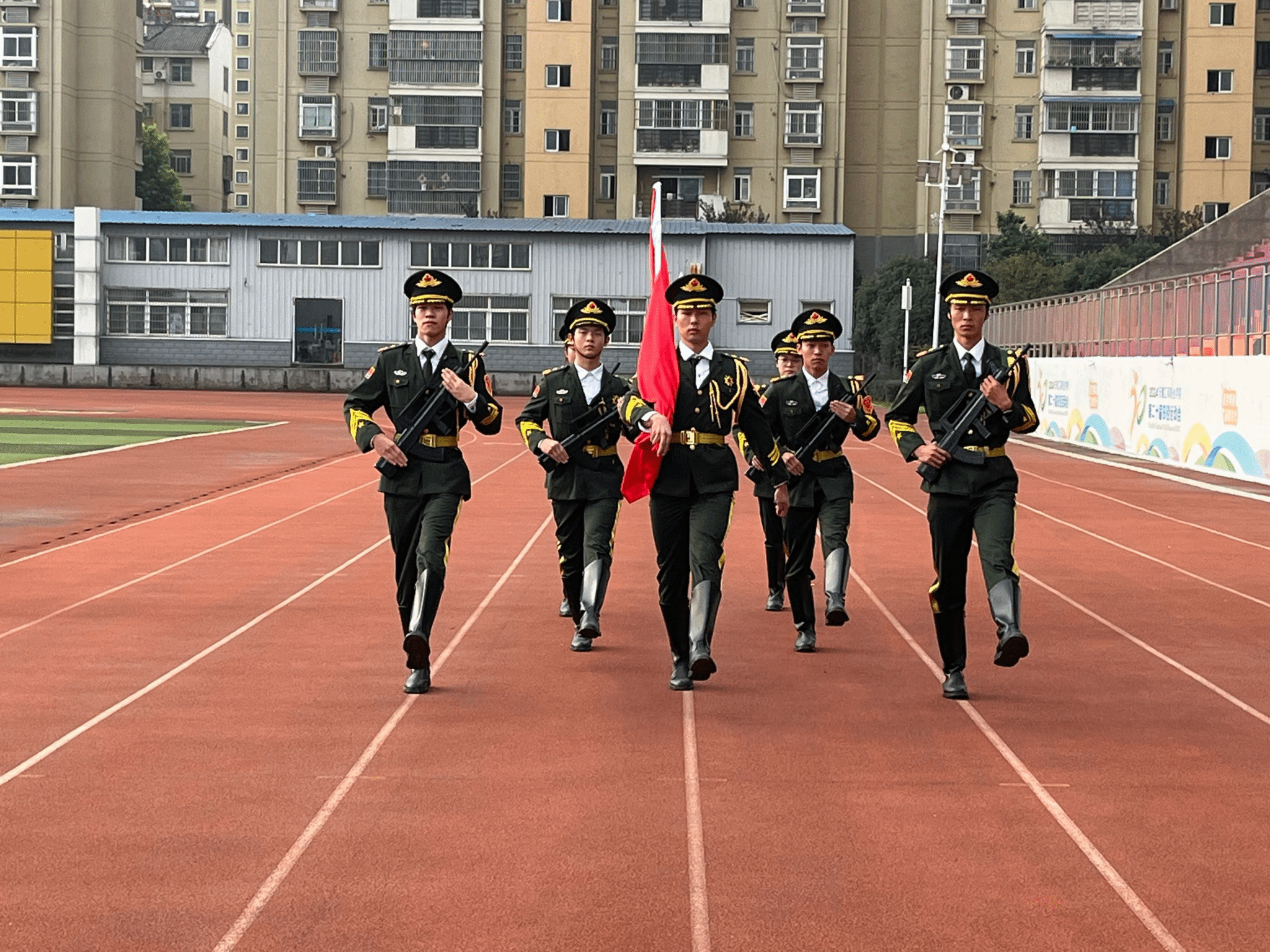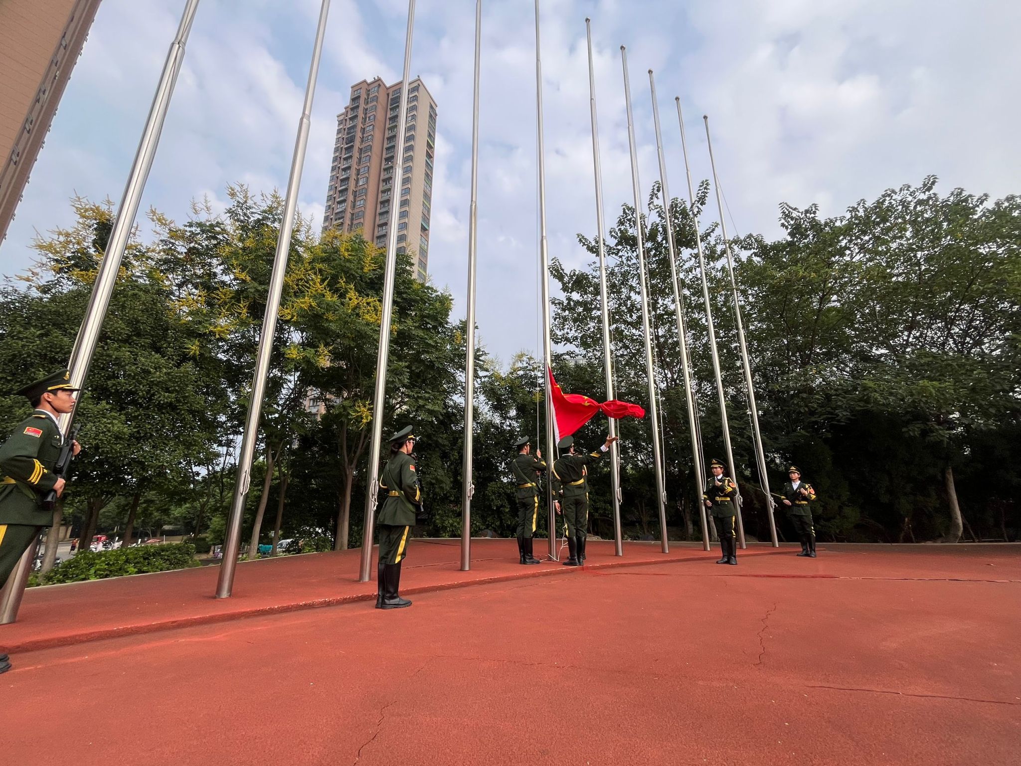 清晨七点二十分,英姿飒爽的国旗护卫队成员迈着铿锵有力的步伐,迎着朝阳,以饱满的热情护送着鲜艳的五星红旗缓缓走向升旗台。伴随着雄壮的《义勇军进行曲》,全体师生面向国旗肃立致礼,高唱国歌。五星红旗在熠熠晨光中随风飘扬,点燃了在场师生满腔炽热的爱国之情。