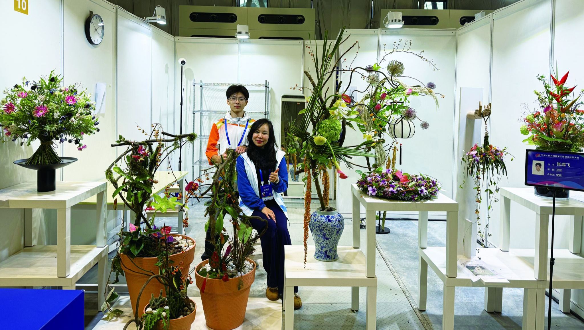 本届大赛花艺项目堪称“指尖上的综合较量”,9个比赛模块中,5个模块被设计为“惊喜盒”。选手仅在赛前15分钟知晓题目,全面考验设计思维、临场应变与技艺熟练度。三天赛程中,张成飞需在新娘花饰、植物种植、花束等高强度任务中连续作战近18小时,其作品在创新性、技术规范与艺术表现张力上均获裁判组高度评价。