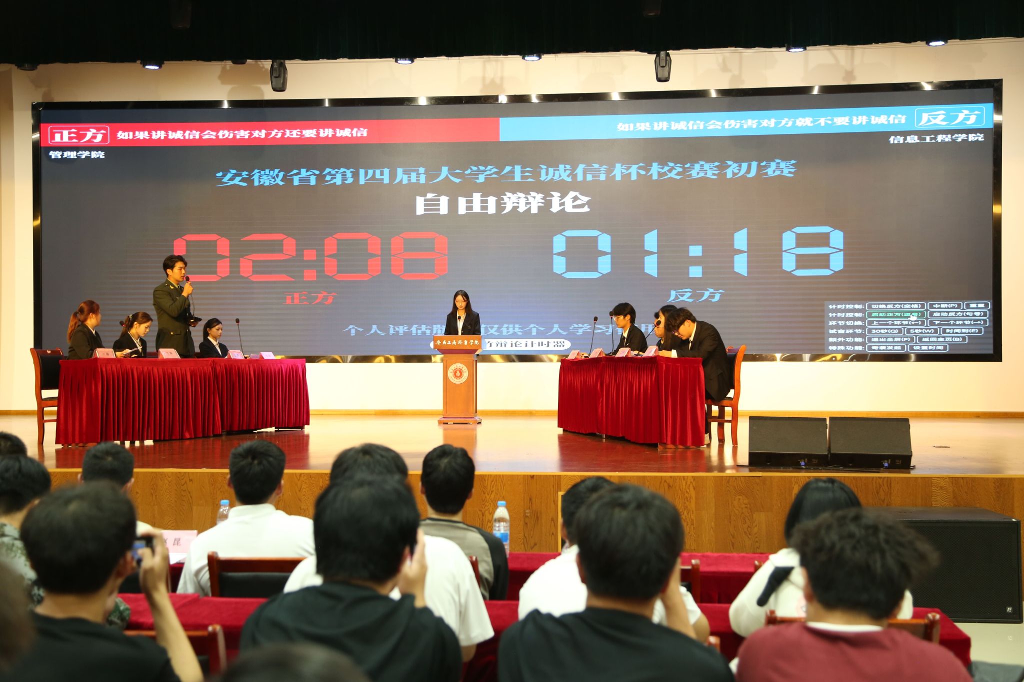 决赛争锋:仰望星空,脚踏实地。10月13日的决赛现场,思辨热度再度升级。会计学院与智能制造与汽车学院就“DeepSeek人工智能模型爆火引发的造假现象”展开前沿论战,深度剖析“人工智能迅猛发展对信用体系建设利大于弊还是弊大于利”。旅游健康学院与艺术设计学院则回归价值本源,探讨“人之立身处世,能力与诚信何者更重要”,引发现场对人生基石与成功路径的深层思考。