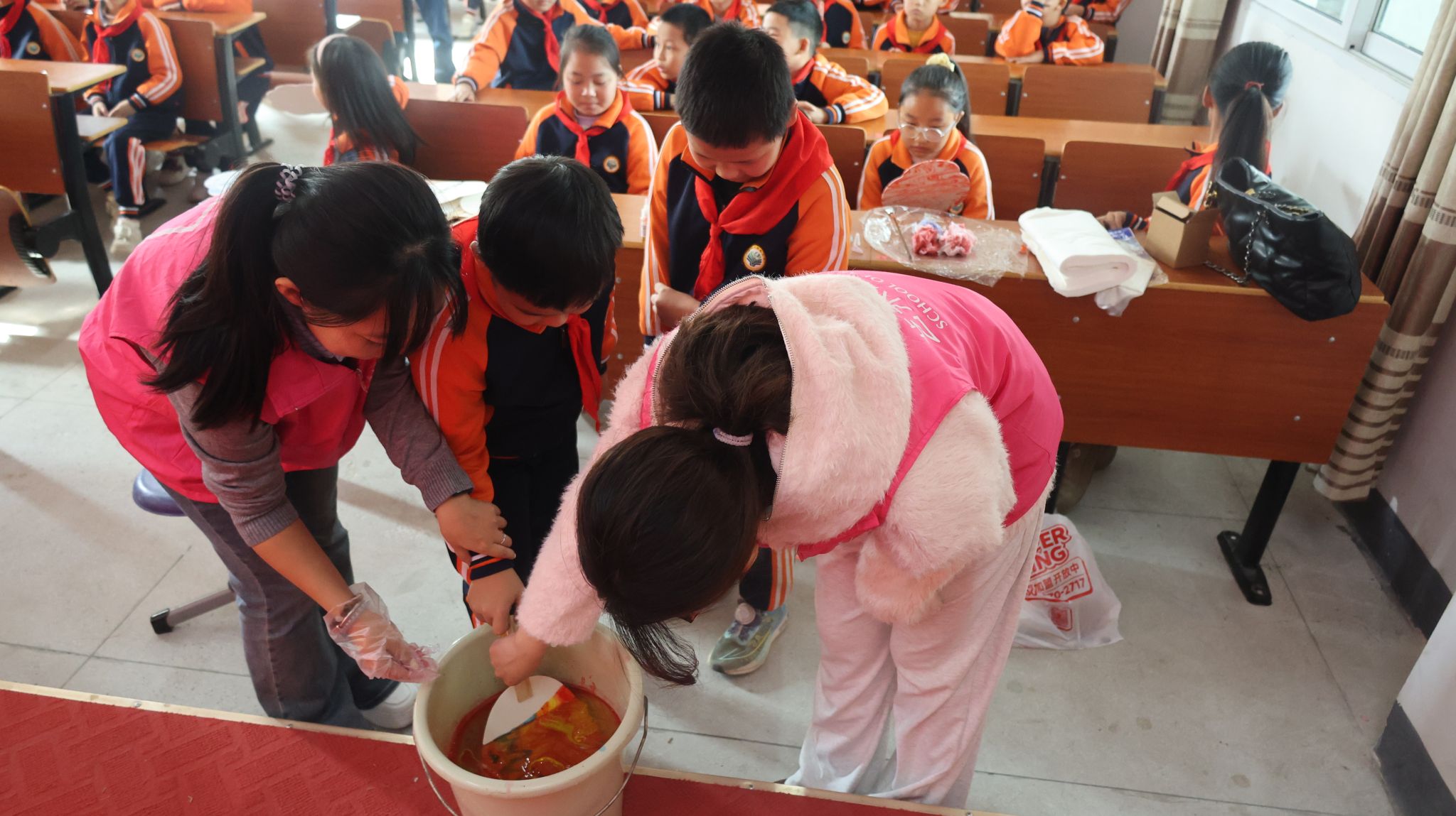 活动当日,志愿者们首先通过生动的图片和故事,为孩子们讲解了漆艺的悠久历史与文化内涵,在他们心中播下了传统文化的种子。随后,在志愿者的耐心指导和一对一协助下,孩子们开始了奇妙的漆扇制作之旅。