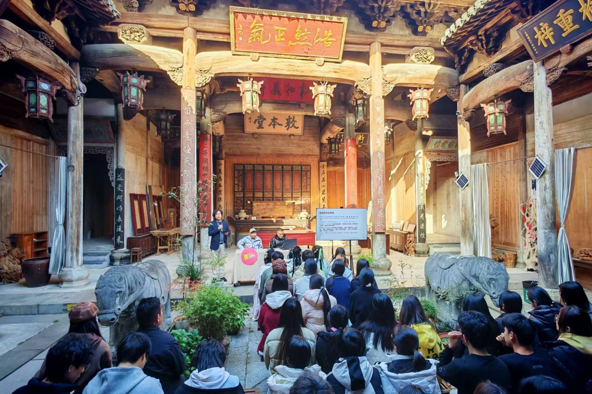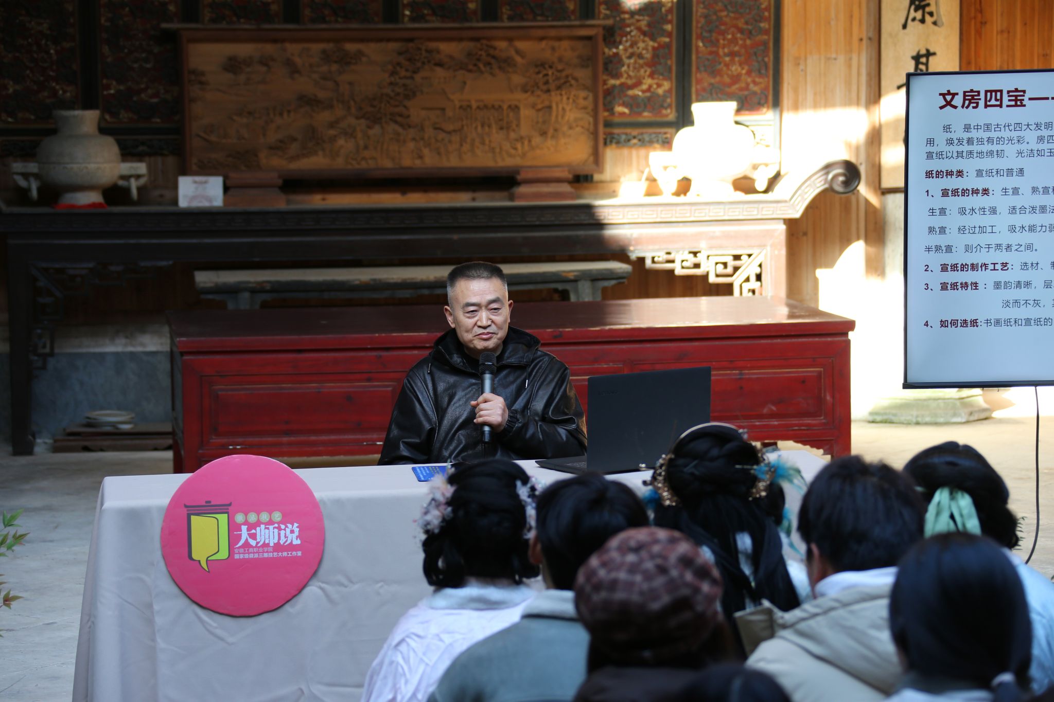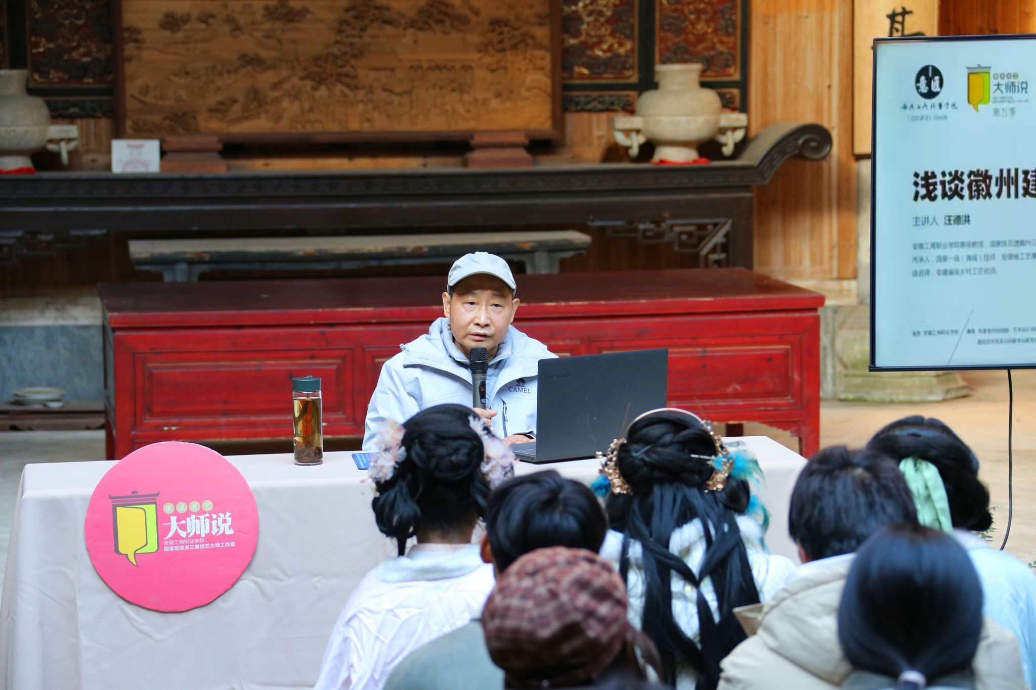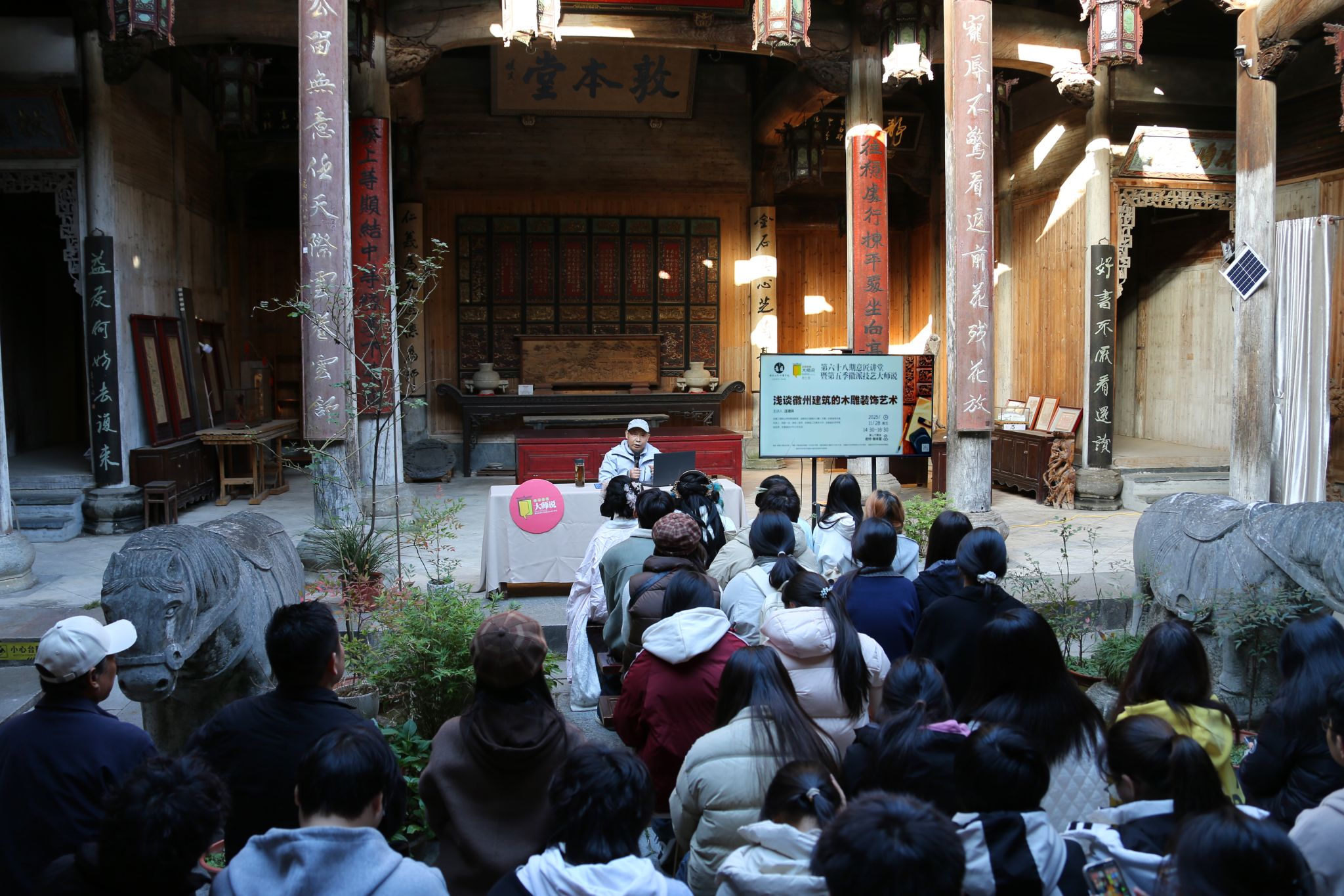 11月28日下午,黄山市黟县宏村·敦本堂内高朋满座,学术氛围浓厚。由安徽工商职业学院主办的第68期《意匠讲堂》暨第五季《徽派技艺大师说》学术讲座在这里隆重举行。本次活动由校党委委员、党委宣传统战部部长、艺术设计学院党总支书记孔成主持,艺术设计学院广告艺术设计专业、安徽新闻出版职业技术学院艺术设计专业近百名师生参加讲堂。