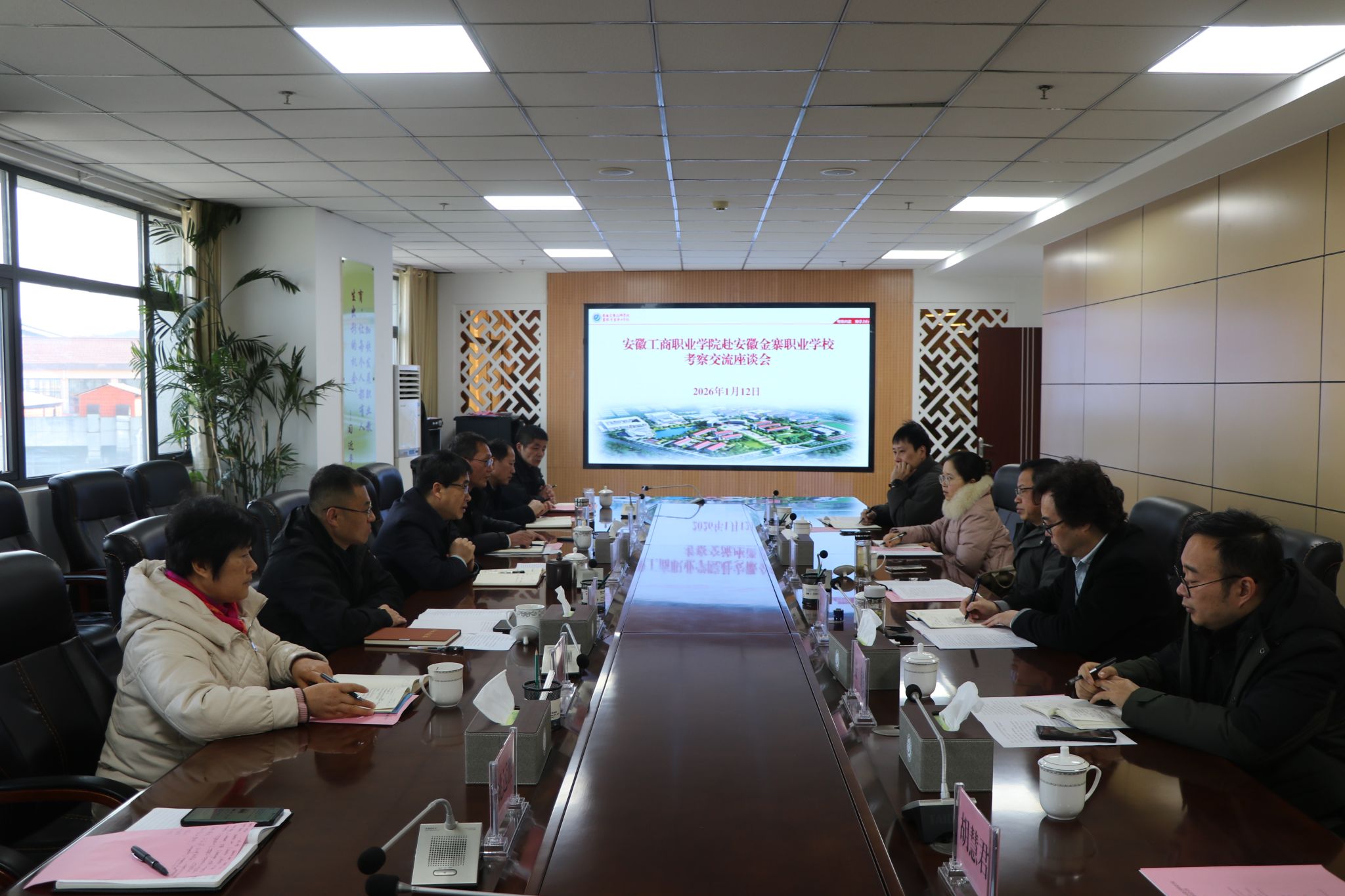 1月12日上午,安徽工商职业学院党委委员、副校长胡捍东,党委委员、党委宣传统战部部长孔成等一行6人赴安徽金寨职业学校,开展校际合作深化交流活动,并专程看望该校挂职副校长边昊同志。安徽金寨职业学校党委书记纪昌国,党委委员、副校长郑齐鹏热情接待,双方相关职能部门负责人参与座谈交流。