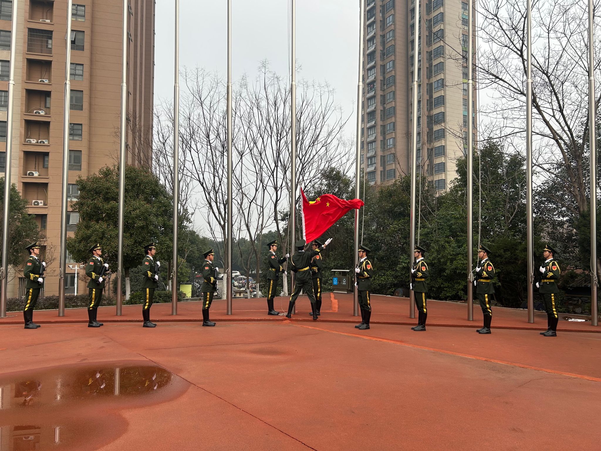 7时20分整,国旗护卫队迈着铿锵有力的步伐,护送鲜艳的五星红旗走向升旗台。在雄壮激昂的国歌声中,全体师生行注目礼,齐声高唱国歌。