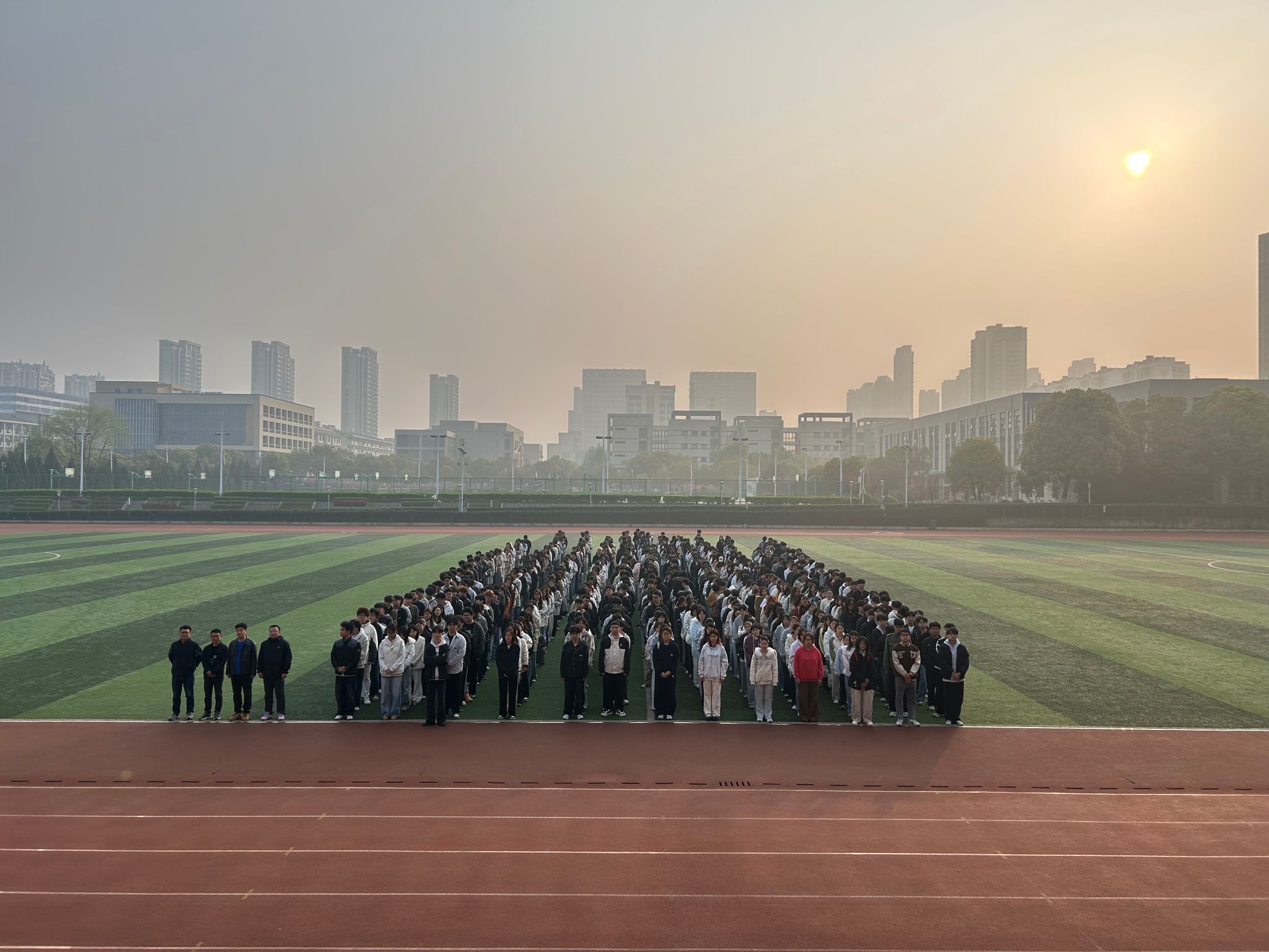七时二十分,国旗护卫队身着戎装、步伐铿锵,护卫着五星红旗走向升旗台。伴随着雄壮激昂的《义勇军进行曲》,鲜艳的五星红旗迎着朝阳冉冉升起,全体师生肃立注目,齐唱国歌,向国旗致以最崇高的敬意。春日的晨光映照在每一张青春的面庞上,庄严肃穆的氛围在田径场上空久久回荡。