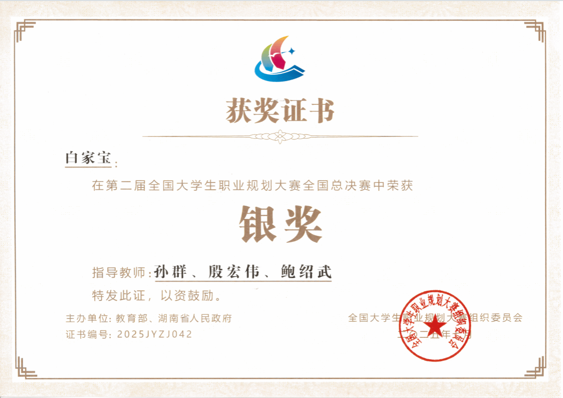 在学校里,鲍绍武也是与学生朝夕相处、贴心相伴的辅导员。为更好地将就业引导融入班级管理,实现“育人”与“就业”同频共振,他主动提升专业能力,先后考取了GCDF全球职业生涯规划师、职业指导师(二级)和人力资源管理师一级证书,构建了“学业—就业—敬业”育人模式,将职业生涯教育、基层就业引导贯穿班级管理全过程,用爱心、耐心、细心,守护每一位学生的成长与梦想。