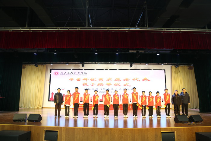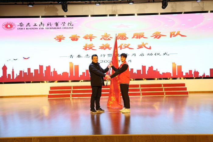 各二级学院党总支书记为志愿者代表授予绶带。陈行为“学雷锋”志愿服务队授旗。校青年志愿者协会会长郭宇鹏代表全体志愿者向全校师生发出“向雷锋同志学习,积极参与志愿服务活动,在互助与奉献中锻炼自我,在友爱和进步中构建和谐,用青春激情传递爱与希望,让雷锋精神历久弥新,让爱国主义成为校园主旋律最强音!让雷锋精神在安工商的传承永不停歇!”的倡议。帅逸凡同学带领志愿者代表进行志愿宣誓仪式。全体人员与安之声合唱团一起合唱《学习雷锋好榜样》,共同缅怀革命先烈雷锋,唱响雷锋精神。