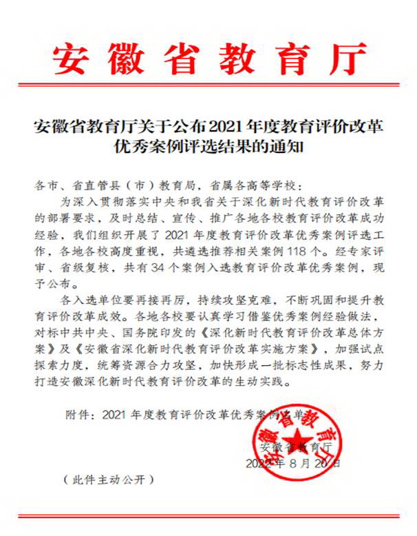 学校将以此次入选为契机,对标中共中央、国务院印发的《深化新时代教育评价改革总体方案》及《安徽省深化新时代教育评价改革实施方案》,再接再厉,凝心聚力,攻坚克难,不断巩固和提升教育评价改革成效,助力高质量发展。(撰稿:赵雪梅 审核:周新春)