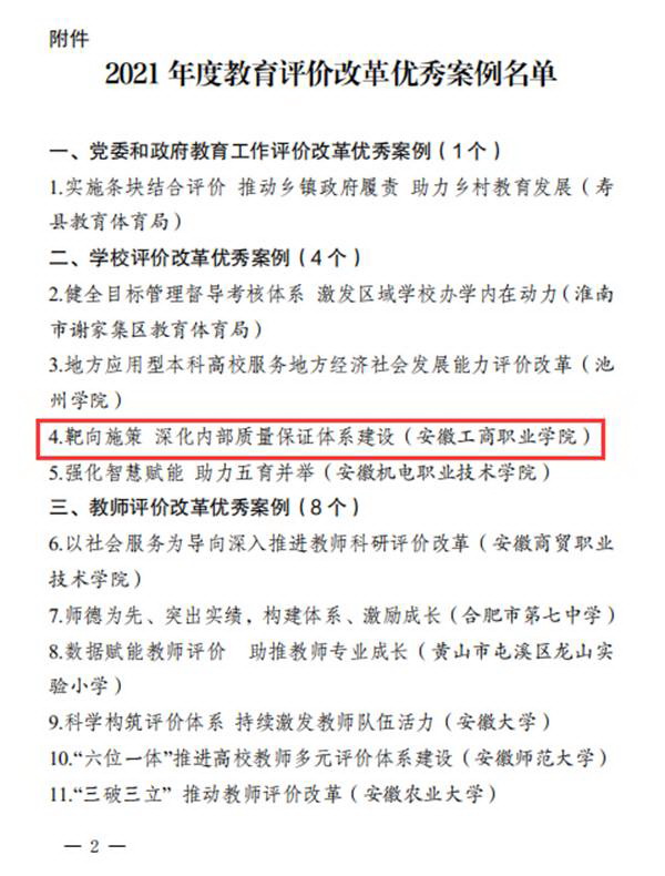 日前,安徽省教育厅公布了2021年度全省教育评价改革优秀案例名单,我校《靶向施策 深化内部质量保证体系建设》案例成功入选。此次评选活动由安徽省教育厅组织,共遴选推荐全省各地各校相关案例118个。经专家评审、省级复核,共有34个案例入选教育评价改革优秀案例。
