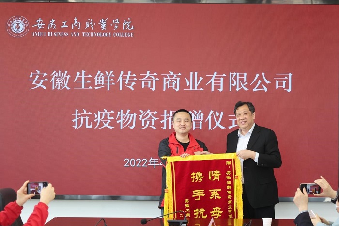 春风送暖,花香满园,4月8日,在综合楼三号会议室隆重举行了安徽生鲜传奇商业有限公司为我校捐赠抗疫物资仪式,这也是本轮疫情发生以来,我校第一次接受校友较大规模抗疫物资捐赠。校党委副书记、校长李雪向安徽生鲜传奇商业有限公司赠送了锦旗。校党委副书记陈行,党委委员、纪委书记黄继胜,党委委员、副校长胡捍东,党委委员、副校长陈章奇以及宣传统战部、管理学院、公共课教学部负责同志和师生代表参加了捐赠仪式。胡捍东主持捐赠仪式。