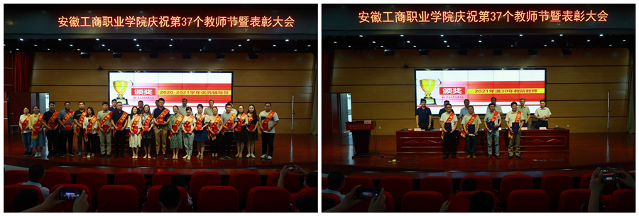 下午2时,在雄壮的国歌声中,大会正式开始。党委委员、副校长张智清宣读了有关表彰决定。大会对10名学校师德模范人选及1名安徽省教科文卫体系统 “师德先进个人”、10个先进集体、40名优秀教师、53名先进工作者、40名优秀辅导员进行了表彰,出席会议的校领导共同为获奖教师颁奖并合影留念,对4名满30年教龄教师颁发了荣誉证书。