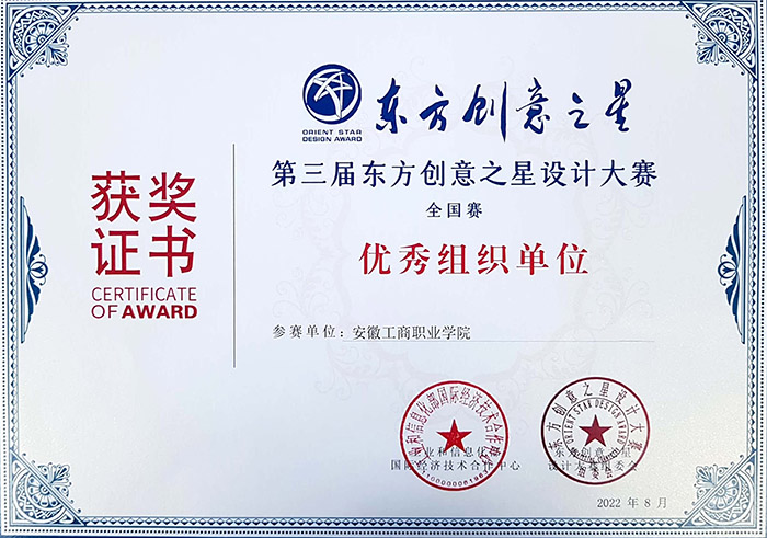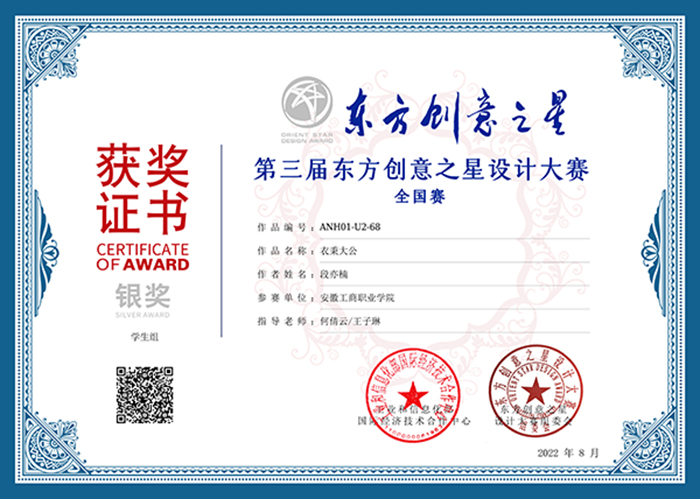 近日,由工业和信息化部国际经济技术合作中心为指导单位,东方创意之星设计大赛组委会主办的第三届东方创意之星设计大赛获奖结果公布。大赛以“设计驱动·产教融合”为主题,覆盖自由命题类、企业命题类、主题设计类三大类别。参加本届大赛的高校共计1030所,参赛作品共计19938件。艺术设计学院师生在本届大赛中共获等级奖项16项,其中省赛金奖1项、银奖1项、铜奖13项;20级产品艺术设计1班段亦楠同学作品《衣秉大公》获得全国赛银奖。除此以外,安徽工商职业学院被大赛组委会评为省赛及全国赛“优秀组织单位”。