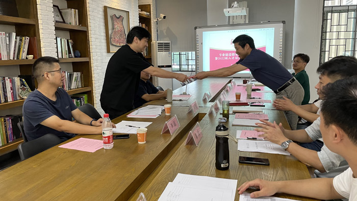 会议第二项由学院党总支副书记、副院长哈春浪宣布专业建设指导委员会委员名单并颁发了证书。安徽大学艺术学院副院长谢亮教授、安徽四夕堂品牌设计有限公司创始人罗以银、阳光电源股份有限公司中央研究院工业设计高级工程师李磊及艺术设计学院5位教学管理人员当选新一届委员。