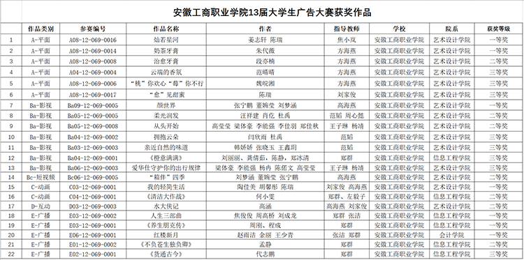 2021年第十三届全国大学生广告艺术大赛已落下帷幕,在本次大学生广告艺术专业的年度盛会上,艺术设计学院、会计学院、信息工程学院的十余名艺术设计专业教师经过3个月的不懈努力,共计指导了约200名在校学生,设计制作完成了145件作品参赛,其中22件作品分获安徽赛区省级奖励,方海燕、高海燕,焦晓岚,刘家俊,郑群和张洁6名教师指导的学生作品获得省级一等奖,该6名教师获得省级优秀指导教师奖;另有省级二等奖6件,三等奖8件。