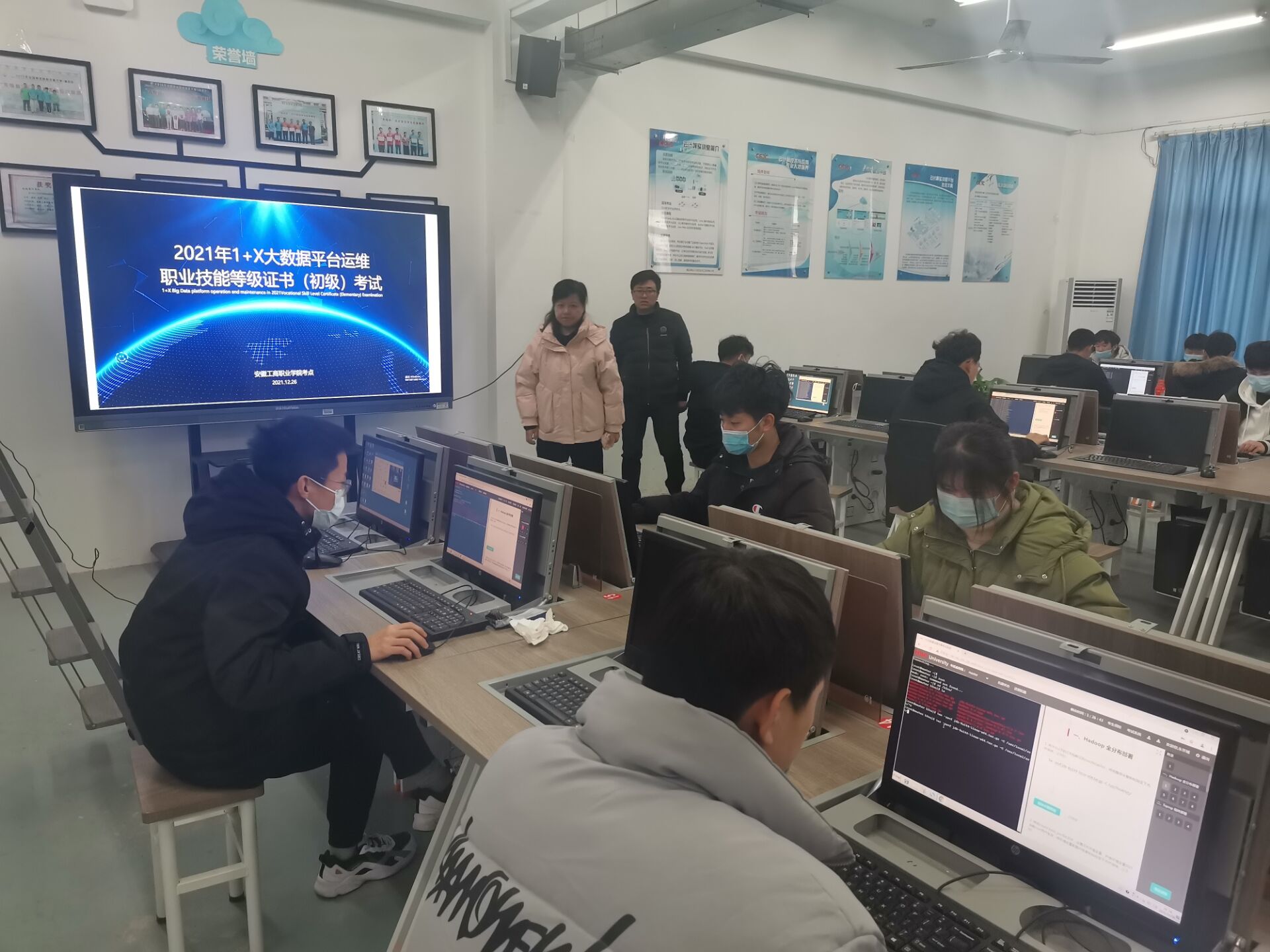 12月26日,2021年1+X大数据平台运维职业技能等级证书(初级)认证考试在我校举行,信息工程学院共有30名学生参加了本次考试。本次等x级认证工作从筹备组织到培训考核得到校院领导及教务处的大力支持,考试由评价组织新华三技术有限公司组织实施,我校作为此次考试的考点之一,协同参与考务组织工作,考试当天,学院领导亲临考试现场巡视指导。