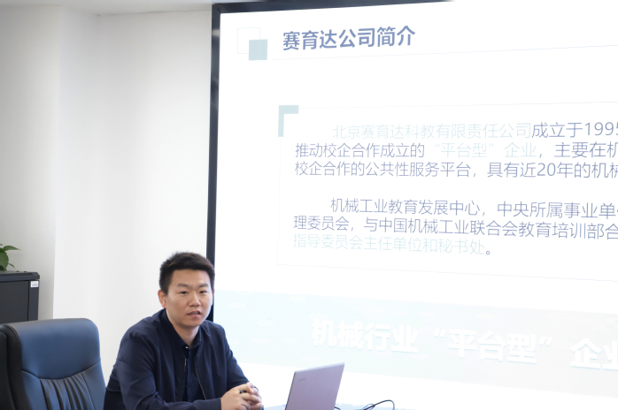耿东川代表企业一行人对学校的热情招待表示了感谢,并围绕“赛育达公司简介、工业机器人X证书推进情况、增材制造及智能线系列X证书推进情况和下一步工作方向”四个方面,介绍了北京赛育达科教有限责任公司的发展历程、行业特色和远景规划等,重点介绍了工业机器人应用编程“1+X”职业技能等级证书试点工作的推进情况,希望能在校企合作、专业建设、教学资源开发、科研与社会服务等方面与学校开展进一步的合作交流。