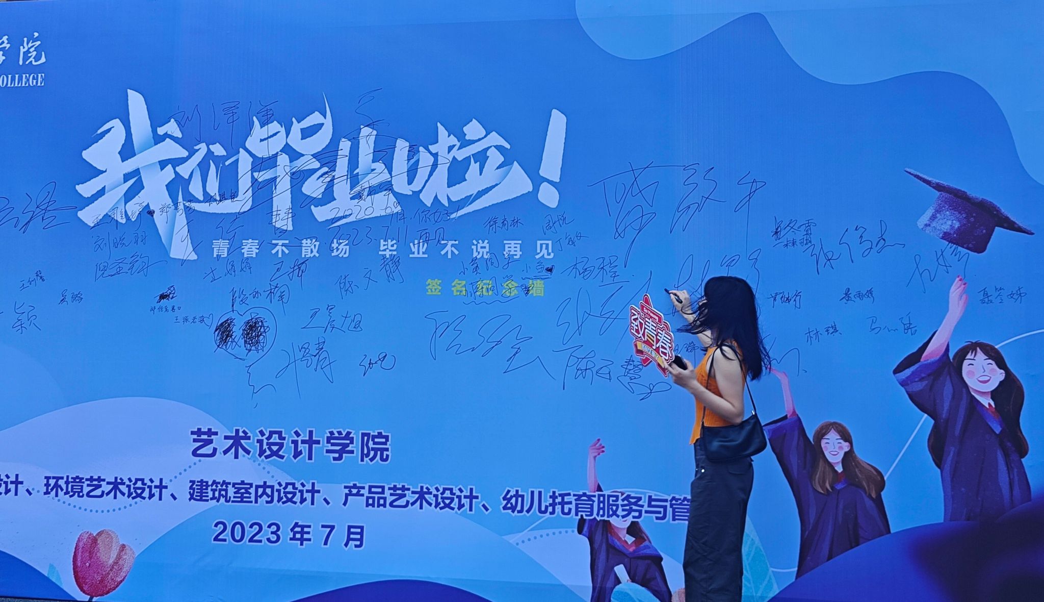 为使同学们三年的校园生活划上圆满的句号,在学校留下青春最美的记忆,学院制作了签名墙,并贴心的准备好拍摄道具、签字笔等物品,供同学们拍照留念。学院领导、老师还与同学们亲切合影。
