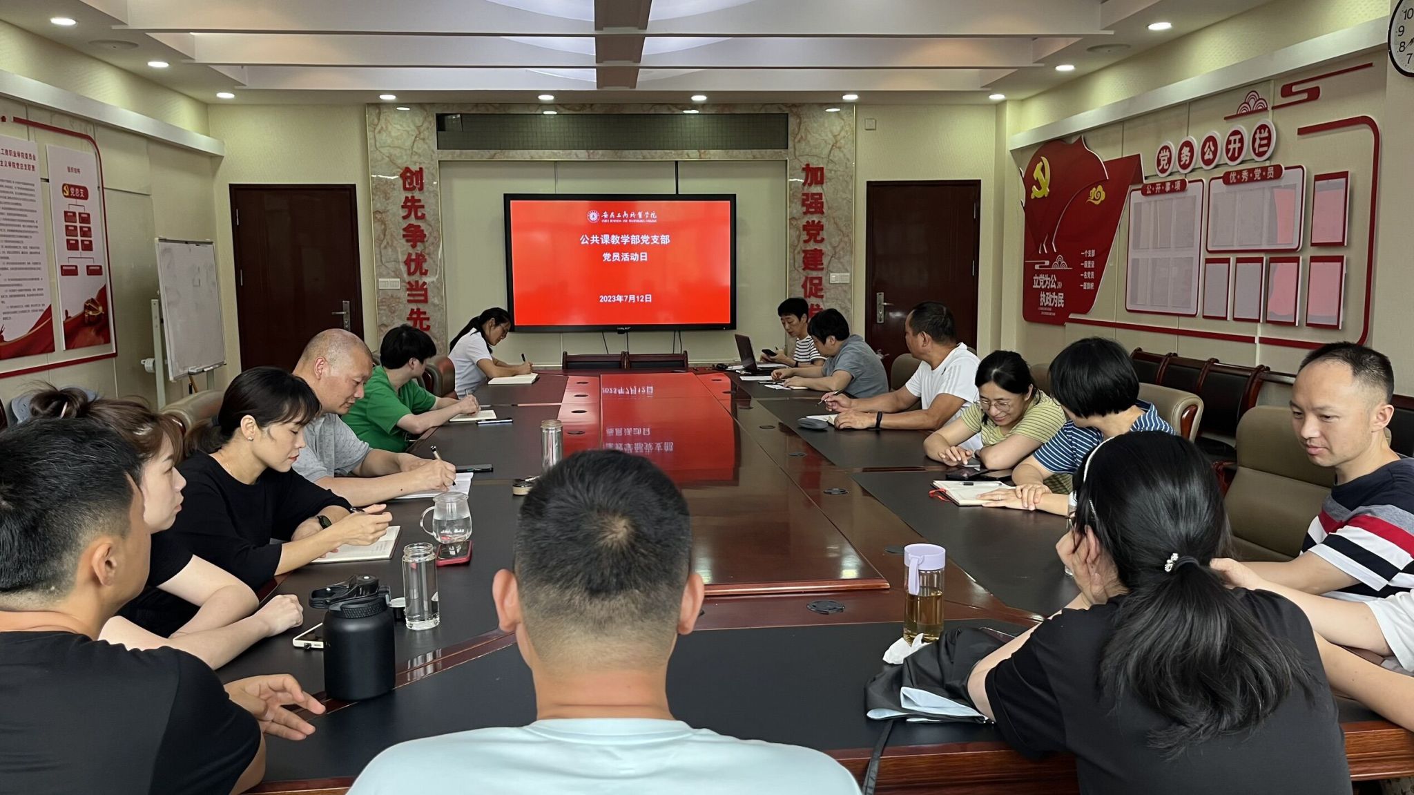 7月12日,公共课教学部党支部在党员活动室组织开展党员活动日活动,组织学习了习近平总书记关于加强教师队伍建设的重要指示批示精神,学习省委书记韩俊在省委主题教育领导小组第二次会议暨主题教育座谈会上讲话以及在安徽农业大学主题教育调研座谈会上的讲话精神等,支部全体党员参加活动,活动由党支部书记何丽主持。