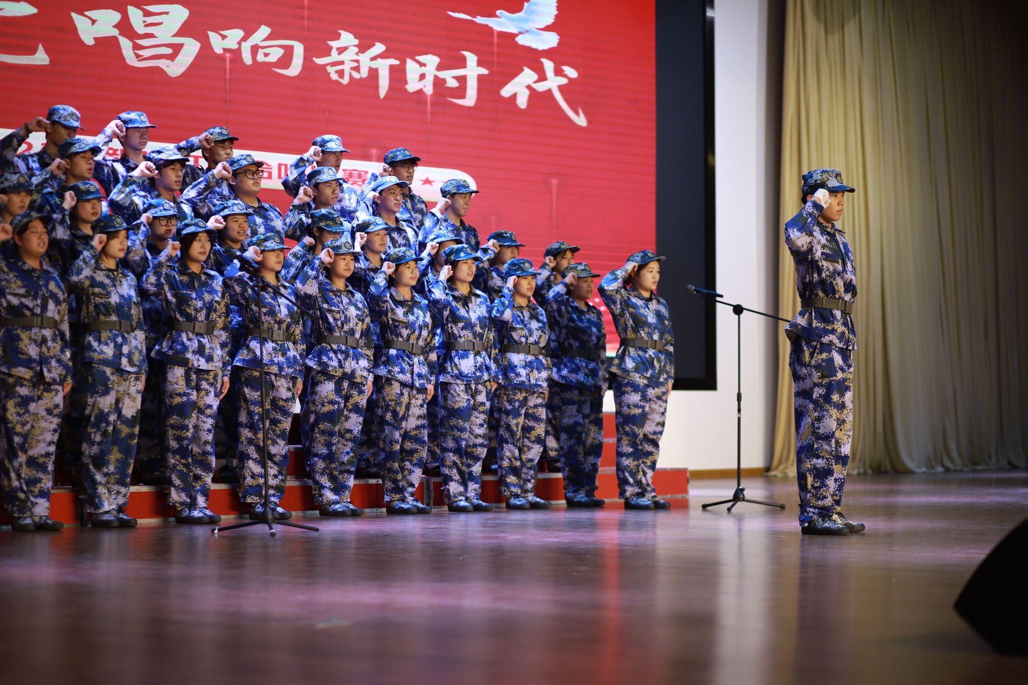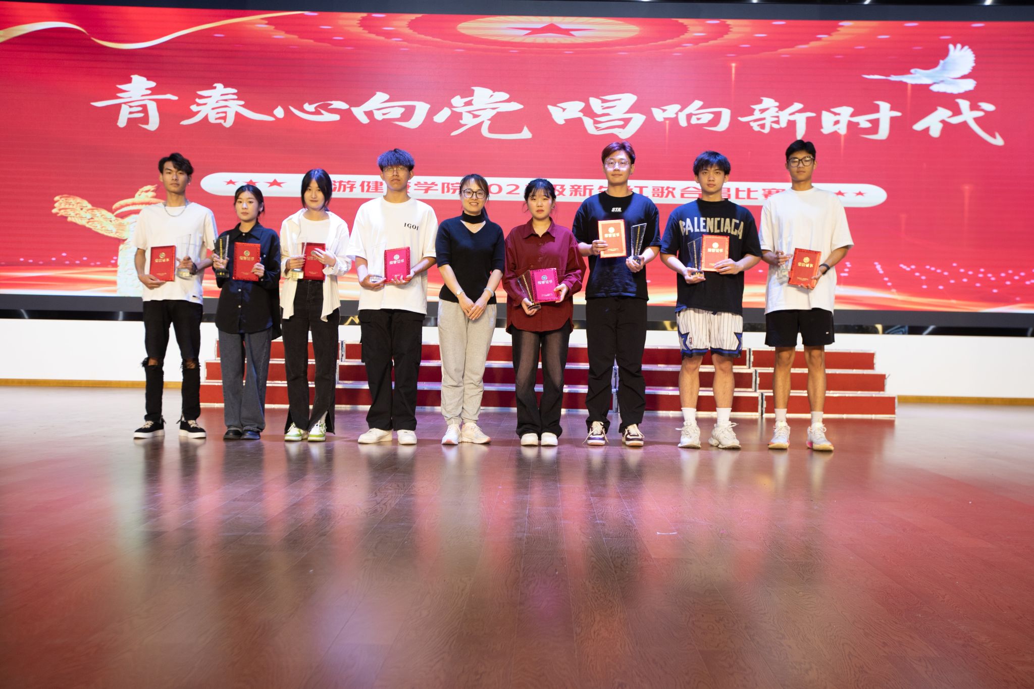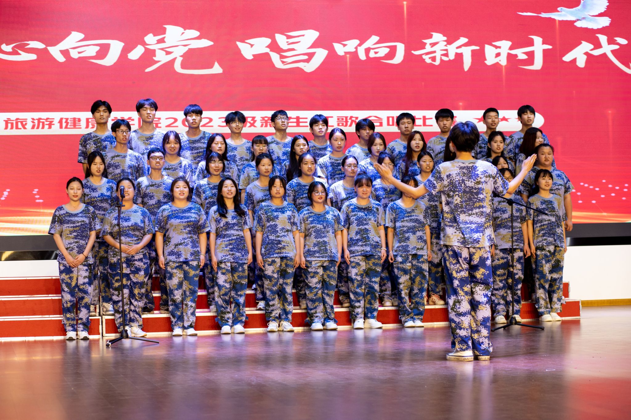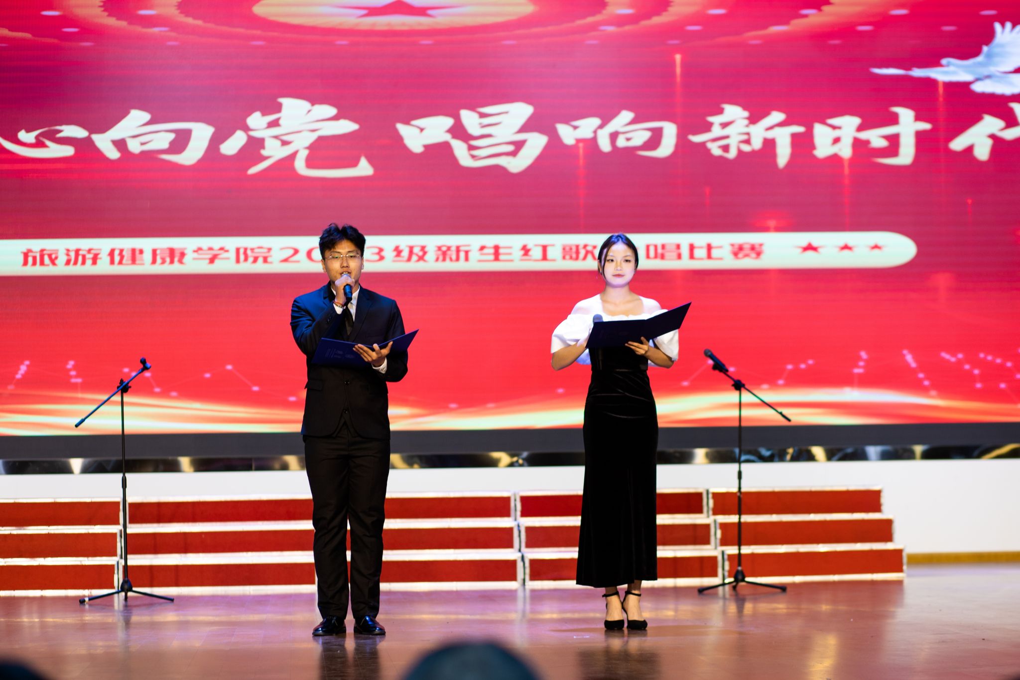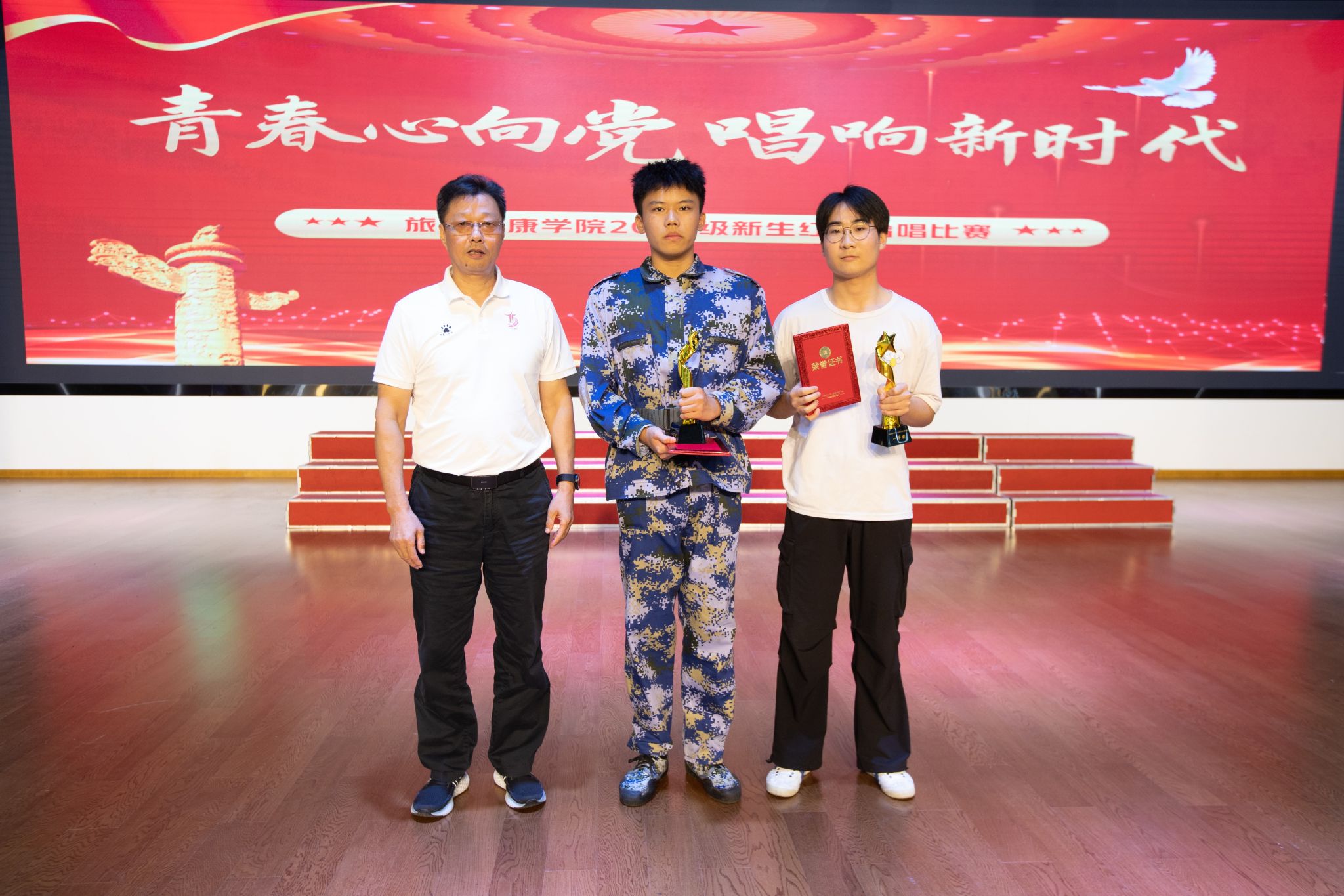比赛现场红歌飘扬,声声入耳,从始至终贯穿爱国、爱党的红色基调,《保卫黄河》《祖国不会忘记》《复兴之路》《没有共产党就没有新中国》《学习雷锋好榜样》等红色经典歌曲带领师生穿越波澜壮阔的历史长河,生动体悟革命先辈用鲜血和生命谱写的英雄史诗,令人入情入境,心潮澎湃。《少年》《国家》《相亲相爱》《我和我的祖国》《灯火里的中国》等歌曲真切自然,描摹了新时代青年坚定奋斗的模样,表达了旅游健康学院学子由衷的爱国热情和对美好明天的向往。