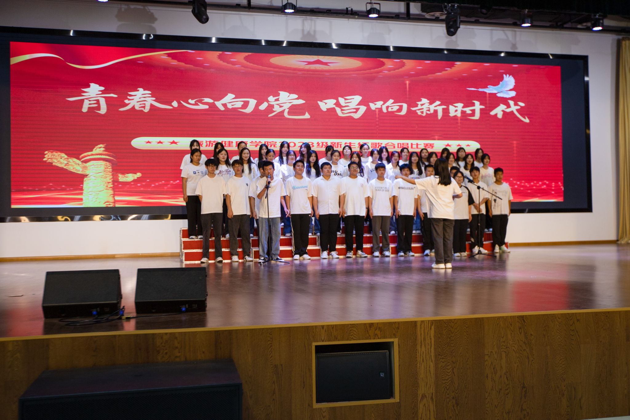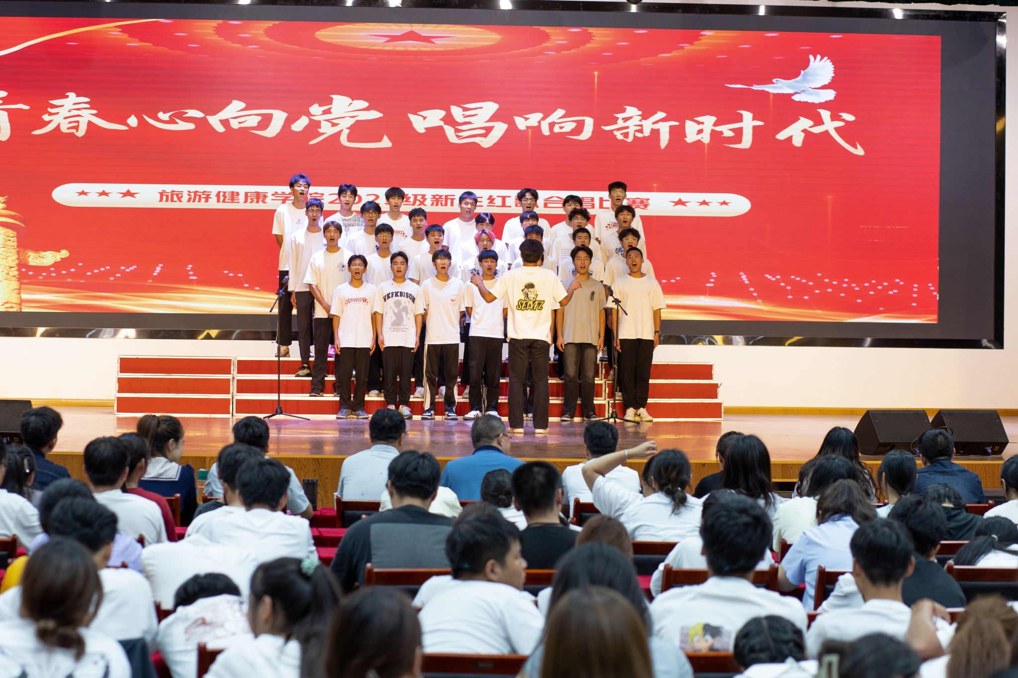 为隆重庆祝中华人民共和国成立74周年,引导青年大学生不断坚定理想信念,树立崇高信仰,让新时代大学生唱响爱党爱国主旋律,歌颂党的丰功伟绩,激发学生的爱党爱国热情。9月28日中午,旅游健康学院举行“青春心向党、唱响新时代”2023级新生红歌比赛,旅游健康学院党政领导班子及全体新生专职辅导员出席本次活动并担任比赛评委。