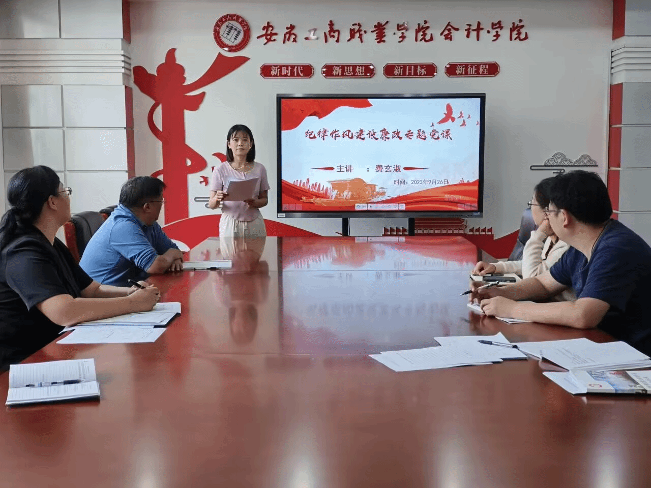 会议伊始党总支书记赵艳从压紧压实党总支管党治党主体责任、严格执行“一岗双责”抓紧抓牢“关键少数”、深化思想教育加强干部队伍作风建设、持之以恒纠治“四风”等方面汇报了2023年上半年会计学院党总支党风廉政建设责任制工作情况,并从压实“一岗双责”、监督检查、执纪问责、廉洁文化四个方面对2023年下半年相关工作进行了具体部署。