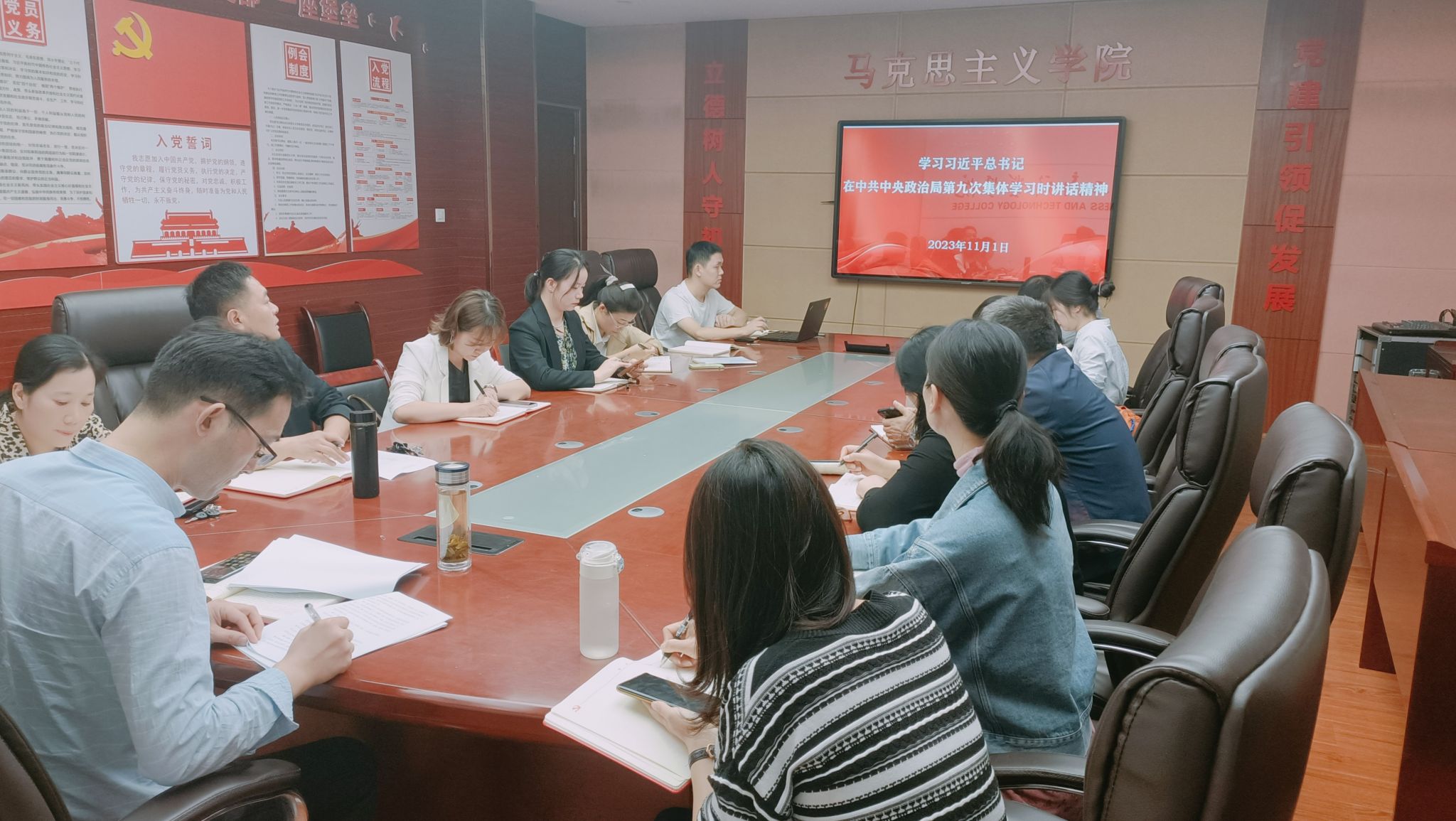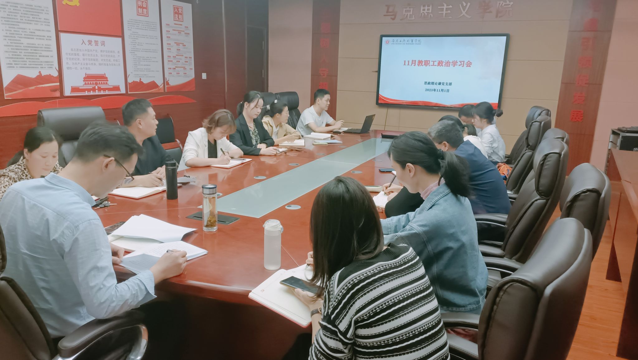 11月1日,思政理论课党支部在明德楼1号会议室召开本学期第3次教职工政治学习会,院党总支书记、院长葛成飞和支部全体教师参加会议,会议由蒋强军主持。