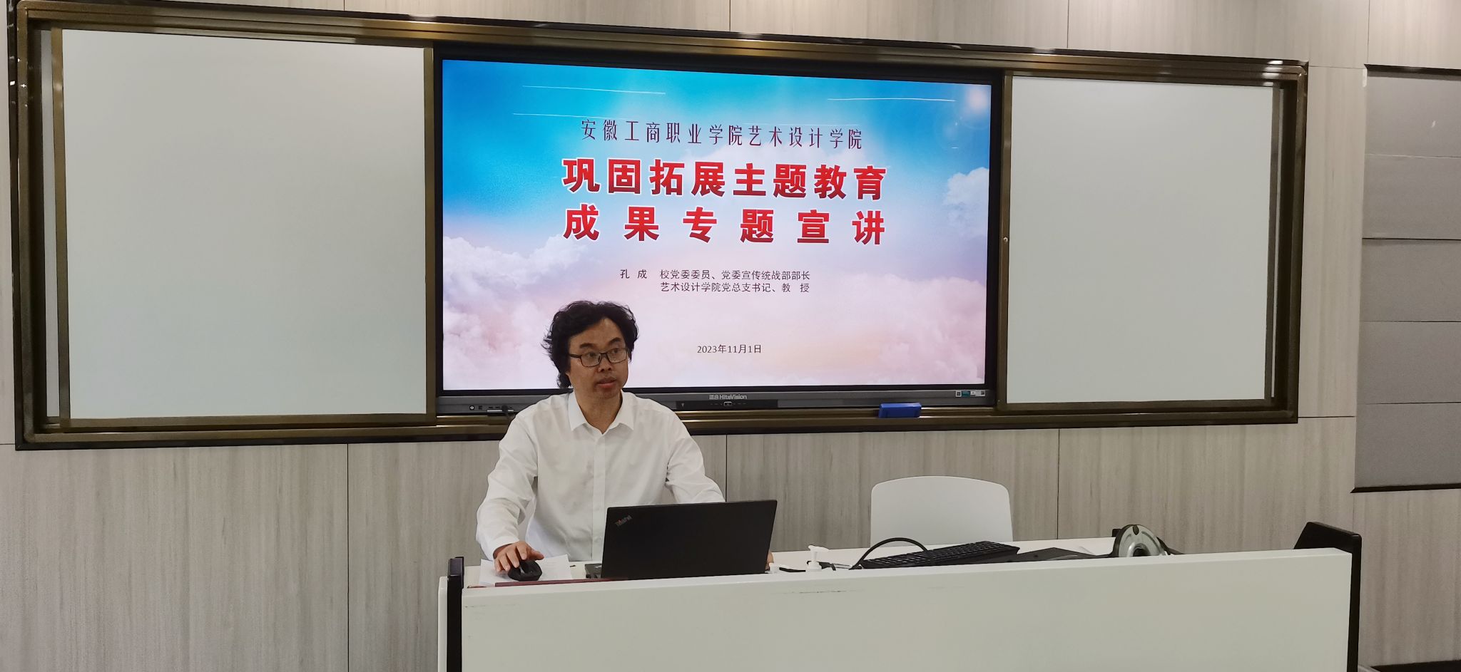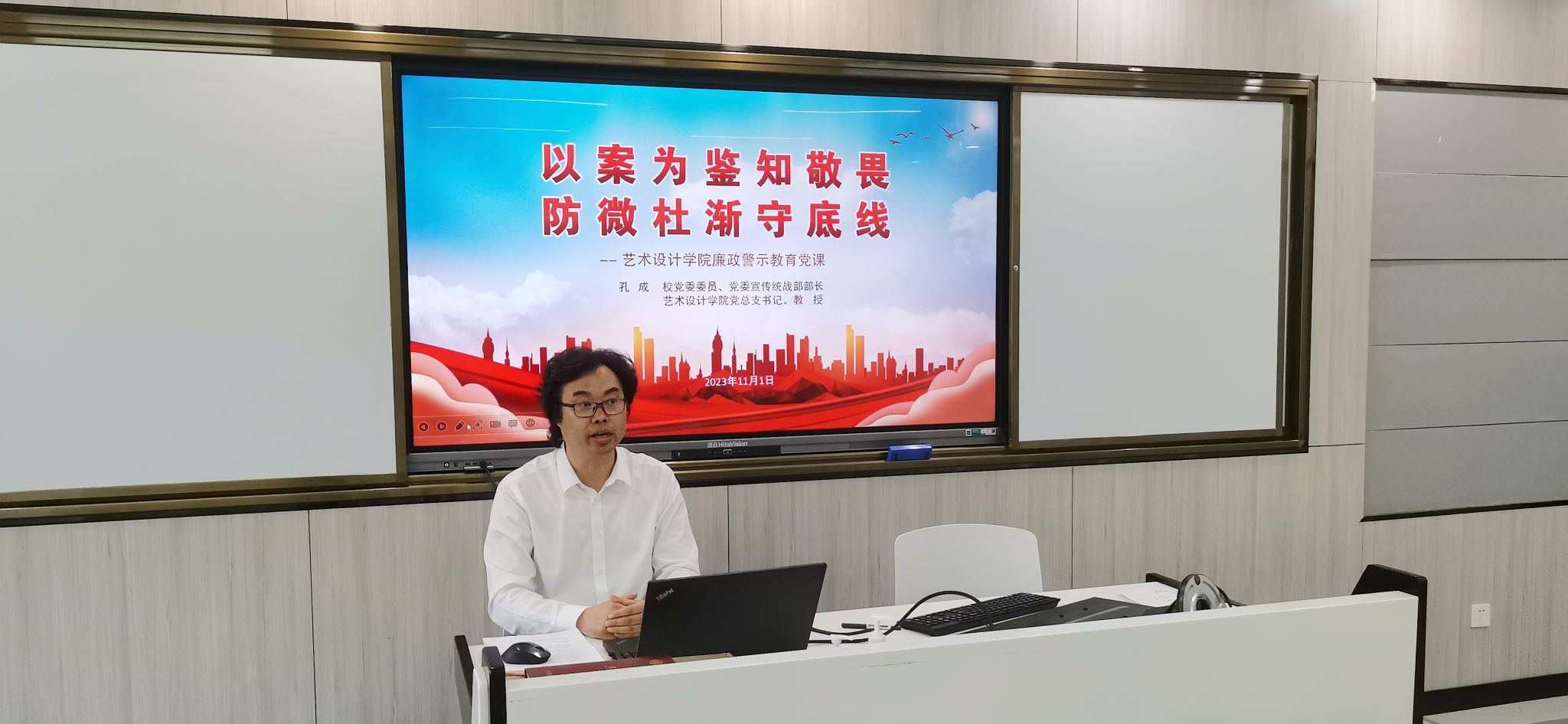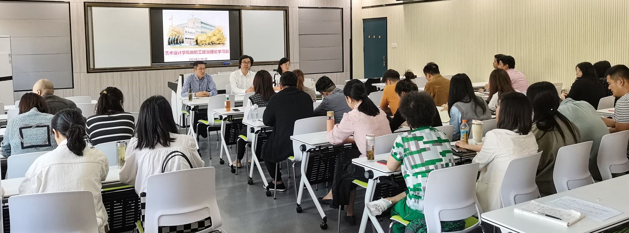 11月1日下午,艺术设计学院党总支在致知楼Z204智慧教室召开十一月份教职工政治理论学习会议,集体学习习近平总书记在中共中央政治局第九次集体学习时讲话精神、习近平总书记在同中华全国总工会新一届领导班子成员集体谈话时讲话精神、习近平总书记在第三届“一带一路”国际合作高峰论坛开幕式上的主旨演讲。校党委委员、党委宣传统战部部长、艺术设计学院党总支书记孔成,艺术设计学院党总支副书记、院长魏芬,总支副书记张乐及全体教职工参加学习。