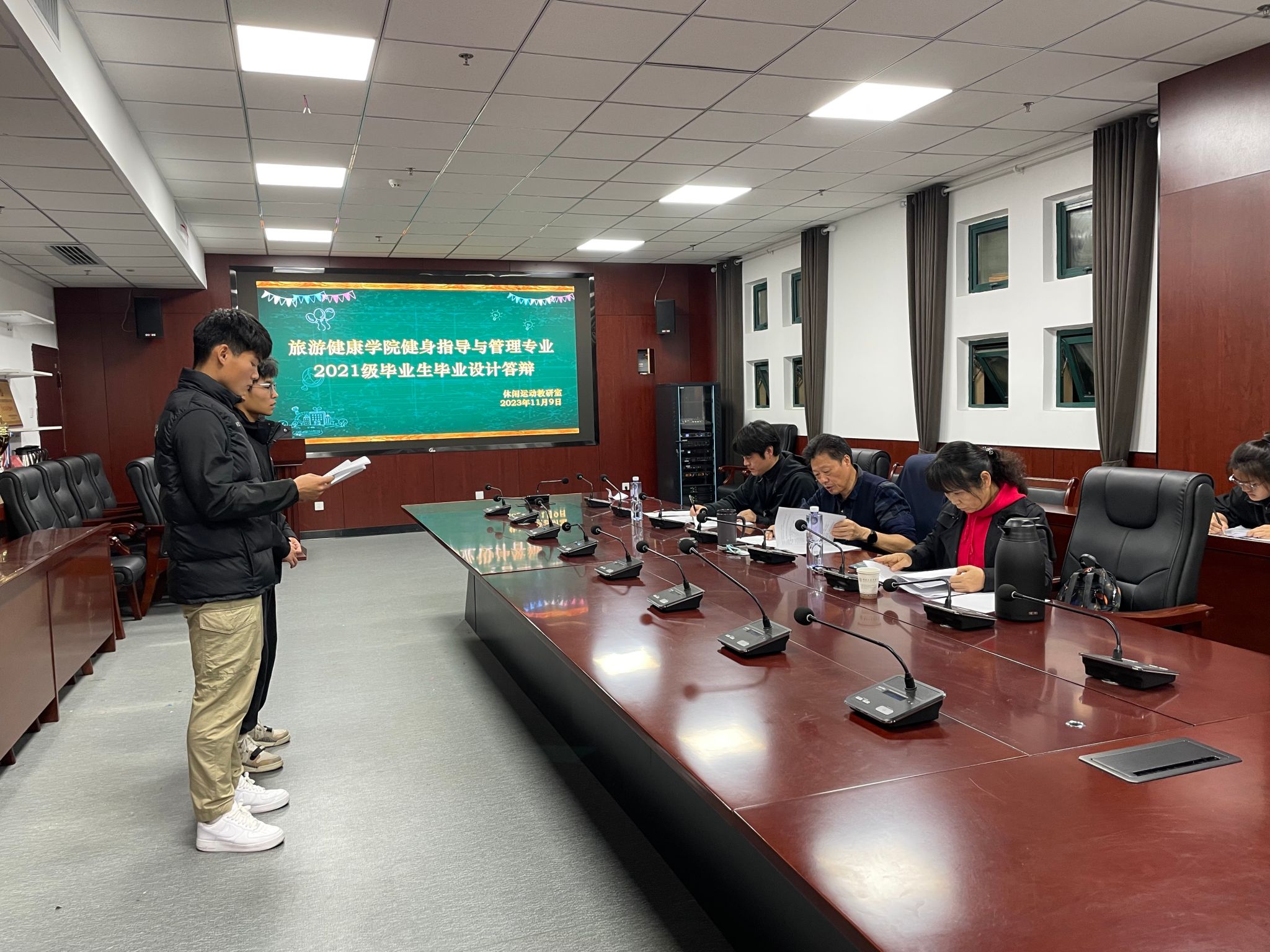 2023年11月9日晚,室外下着小雨,气温略显寒冷,旅游健康学院会议室和休闲运动教研室办公室却是灯火通明、暖意融融,2021级健身指导与管理专业100名毕业生正在紧张、有序地进行毕业答辩,傅绪明、朱玲、张凤、戴本好、邰磊和丁伟等老师作为评委参加了此次答辩。