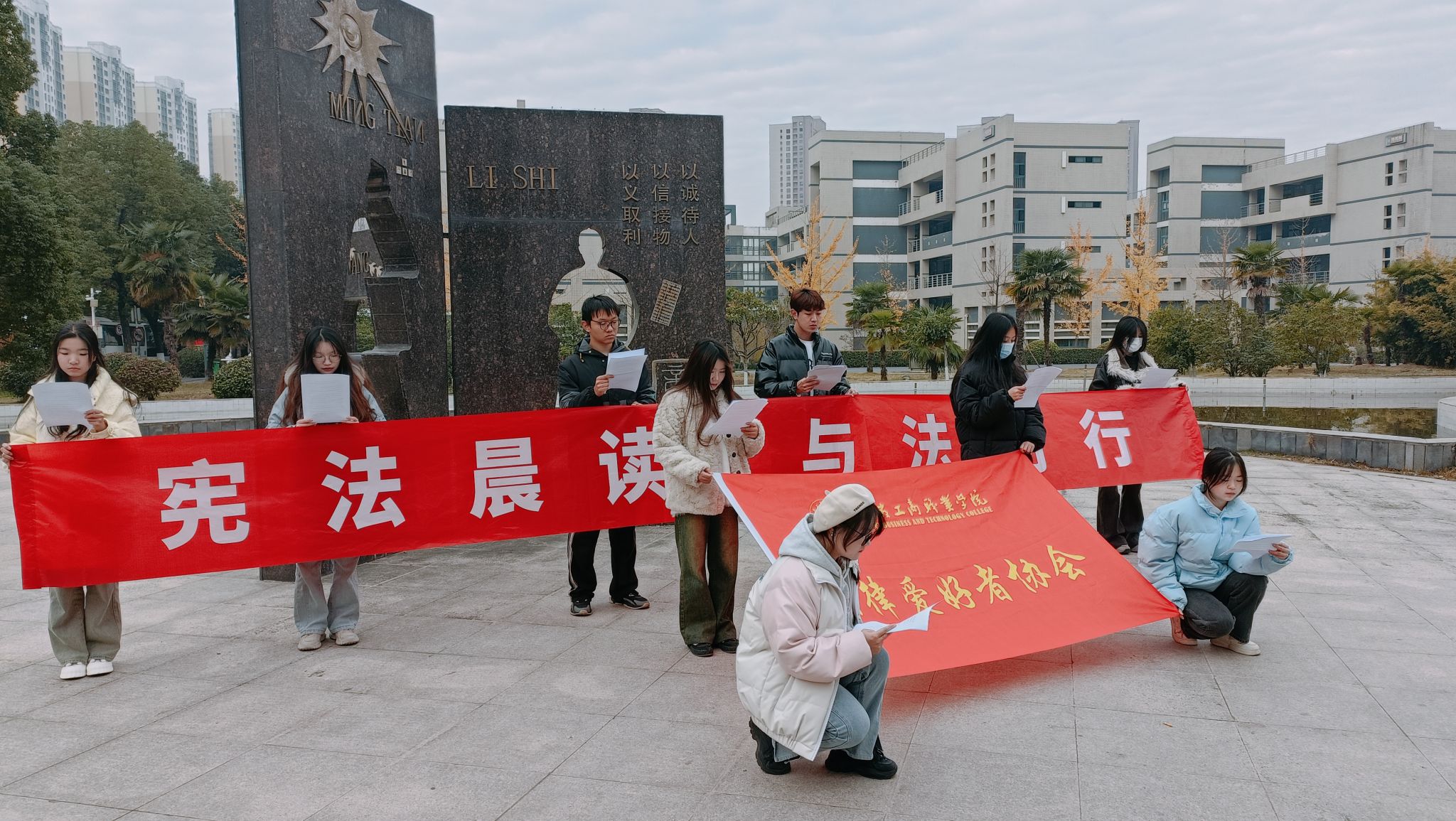 “宪法晨读”宣誓宪法权威。12月4日,法协部分会员代表在校园中进行“宪法晨读”活动,活动后,全体会员在教室共同观看了由教育部组织的“宪法晨读”直播活动,大家再次跟读宪法部分条款,跟唱《宪法伴我们成长》。他们铿锵有力的朗读和歌唱声,表明了“法协”的姿态、展现了青春的活力、宣誓了宪法的权威。