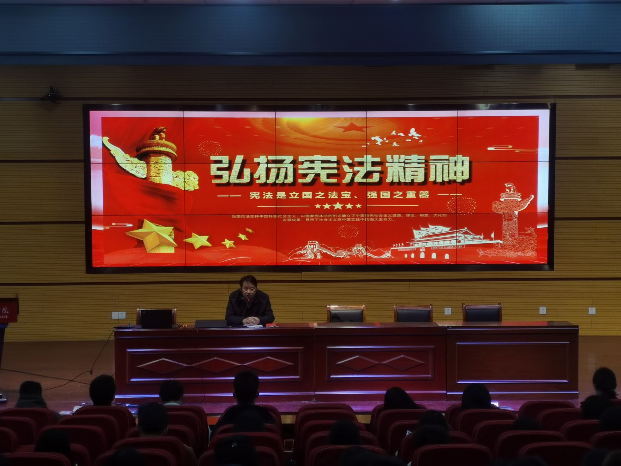 为切实做好12.4宪法日系列活动,提升师生宪法及法律意识,学校联合长丰县委政法委,长丰县公安局、双凤开发区管委会等单位,于12月6日下午在双凤校区学术报告厅开展法治安全专题讲座活动,学校师生代表300多人参加活动。