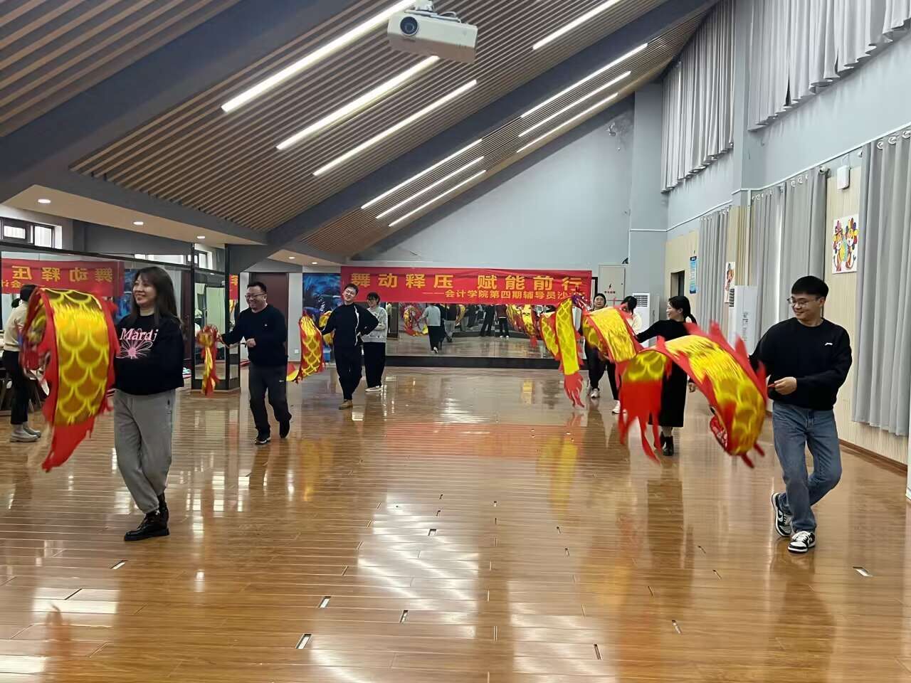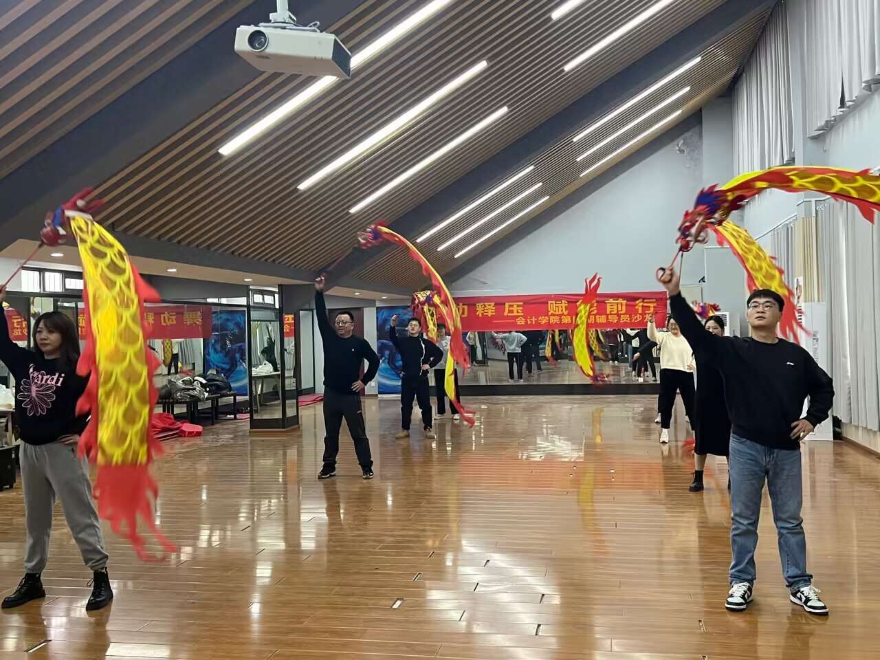活动伊始,赵艳带领大家热身,并现场为大家示范彩带龙,通过手臂的摆动、脚步的移动、腰部的扭动等身体多部位的动作协调配合,让彩绸随着龙头的摆动腾起,如龙飞天。活动现场充满欢声笑语,氛围热烈,在翩翩起舞中释放了压力、放松了心情、舒缓了身心。