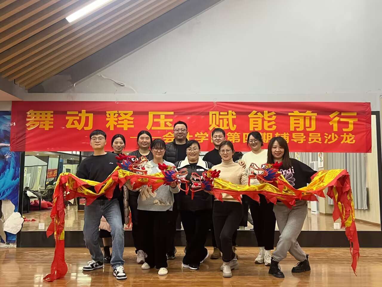 为加强辅导员队伍建设,增进辅导员之间感情与工作交流,促进辅导员以健康的体魄和饱满的精神状态投入工作中,会计学院于2023年12月27日在学校形体房开展了第四期“舞动释压 赋能前行”辅导员沙龙,会计学院党总支书记赵艳和全体专职辅导员参加活动。