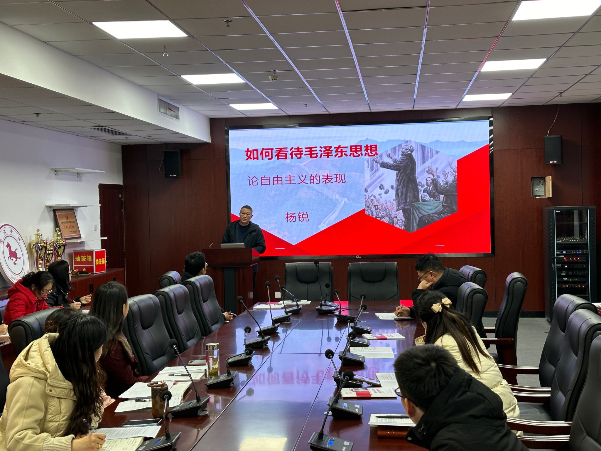 杨锐围绕“中国社会向何处走 中国出路究竟在哪里”、 “什么是马克思主义”、“马克思主义中国化和中国化的马克思主义”三个方面做了题为《如何看待毛泽东思想——论自由主义的表现》的专题党课。指出,马克思主义是关于自然界、人类社会、人类思维发展的一般规律的理论体系,是关于全世界无产阶级和全人类彻底解放的学说,要善于运用马克思主义立场、观点、方法研究和解决工作中的实际问题。