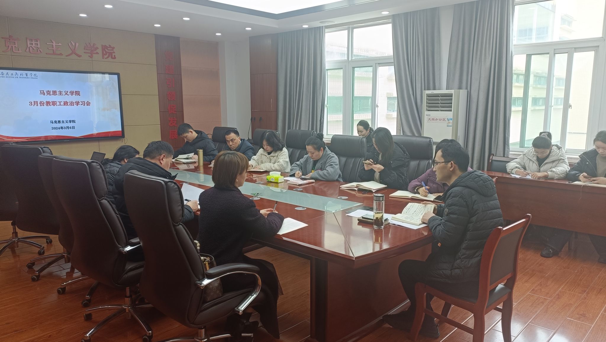 3月6日,马院在明德楼会议室召开本年度第2次教职工政治学习会暨师德师风建设专题会议,学习习近平总书记在中共中央政治局第十一次集体学习时的讲话、在中央全面深化改革委员会第四次会议时讲话精神、2024年全省教育工作会议等,并就师德师风工作进行了专题学习。院党总支书记、院长葛成飞及全体思政教师参加会议,副院长蒋强军主持会议。